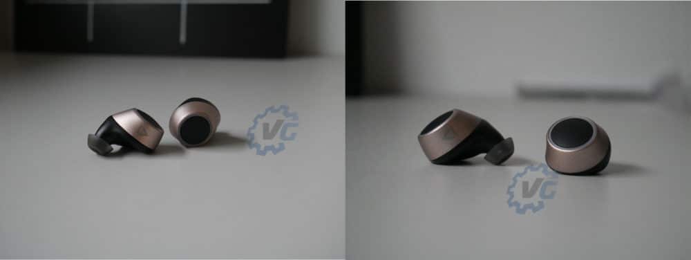Le design des écouteurs plaira à certains et déplaira à beaucoup, notamment à cause de leur couleur principalement dorée (un peu « bling bling »). Mais leur petite taille les rend au contraire très discrets une fois portés ! Un bouton est présent sur chacun d’eux pour vous permettre de mettre en pause votre musique. La bordure de celui-ci s’éclaire en fonction de l’état d’appairage ou de charge des écouteurs (bleu ou rouge avec différents effets de lumière).