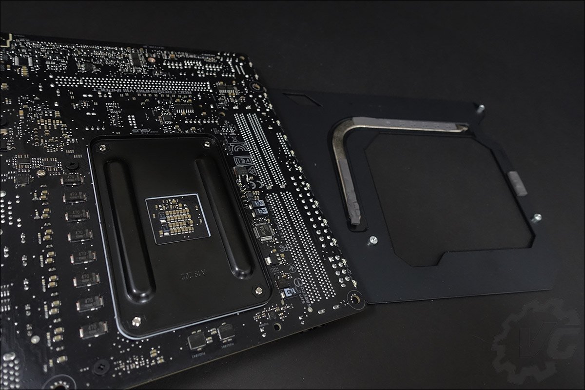 L’espace autour du socket est bien dégagé, ce qui permettra une isolation facile pour les tests sous froid. Au niveau des emplacement mémoires, la carte peut accueillir au maximum 2 barrettes mémoires DDR4. Asus annonce un support des kits mémoires en dual channel jusque 4800 MHz OC+ et pour une quantité maximal de 64 GB. Pour alimenter tout ce petit monde, la carte dispose d’un connecteur 24-pin et d’un 8-pin positionné à coté des emplacements mémoires.