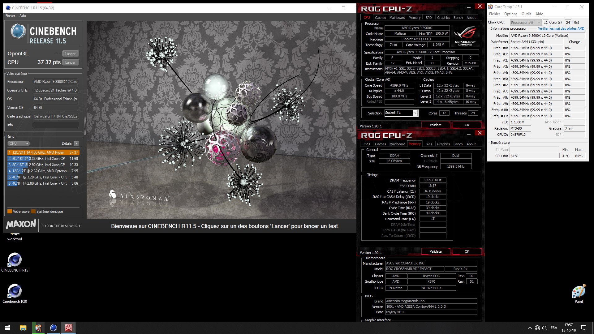 Dans un premier temps, nous avons voulu juger des performances dites « à stock », c’est-à-dire en ne modifiant aucun paramètre du processeur. Le seul élément qui a été réglé au sein du bios, c’est l’activation du DOCP (XMP chez Intel) pour le kit mémoire GSkill NEO testé ici. L’idée est de voir comment se comporte le processeur et jusqu’à quelle fréquence Boost monte les différents cœurs. Pour ce faire, nous avons utilisé le dernier bios officiel en date : la version 1001. Ce bios dispose de la version Amd Agesa 1.0.0.3. Nous avons effectué les relevés sur le benchmark Cinebench R15 et sur la version R20.
