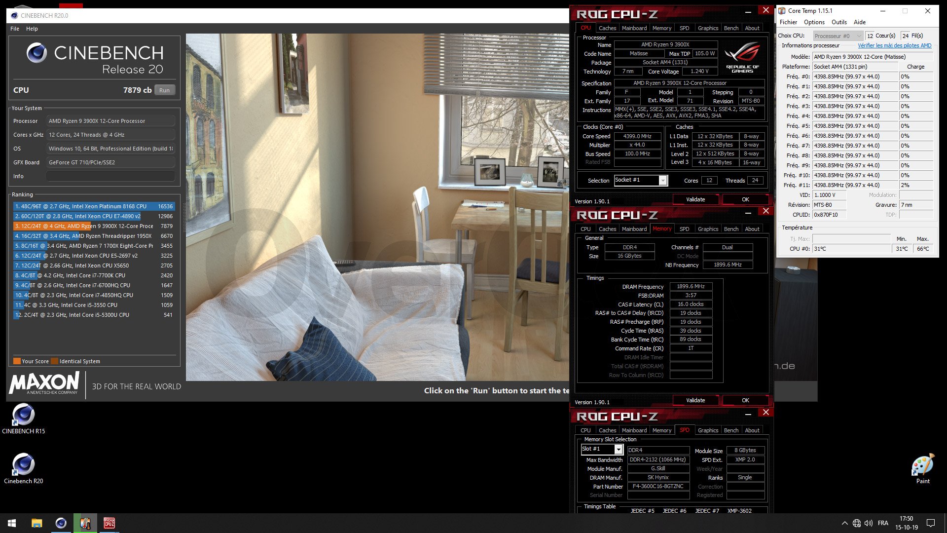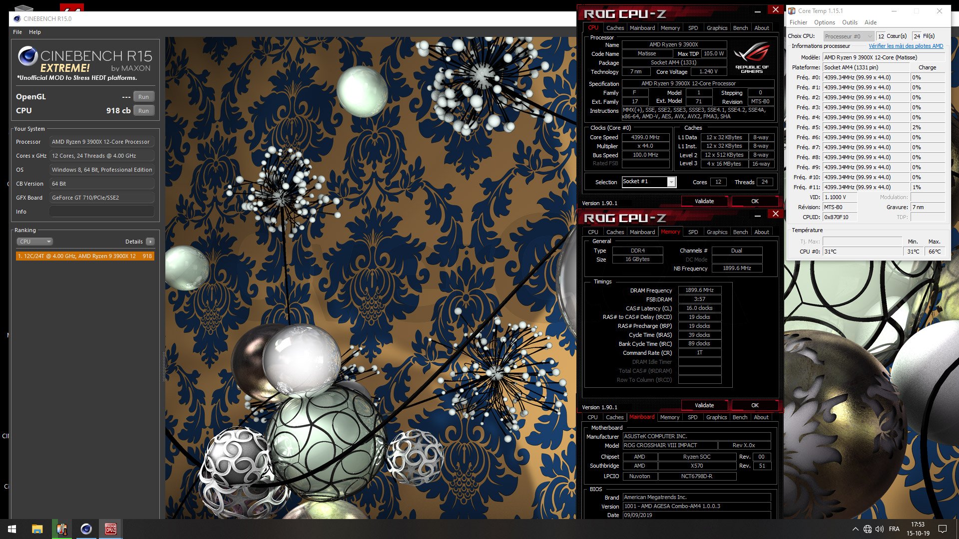 Notre exemplaire est capable de passer, sous watercooling, Cinebench R15 dans ces conditions :