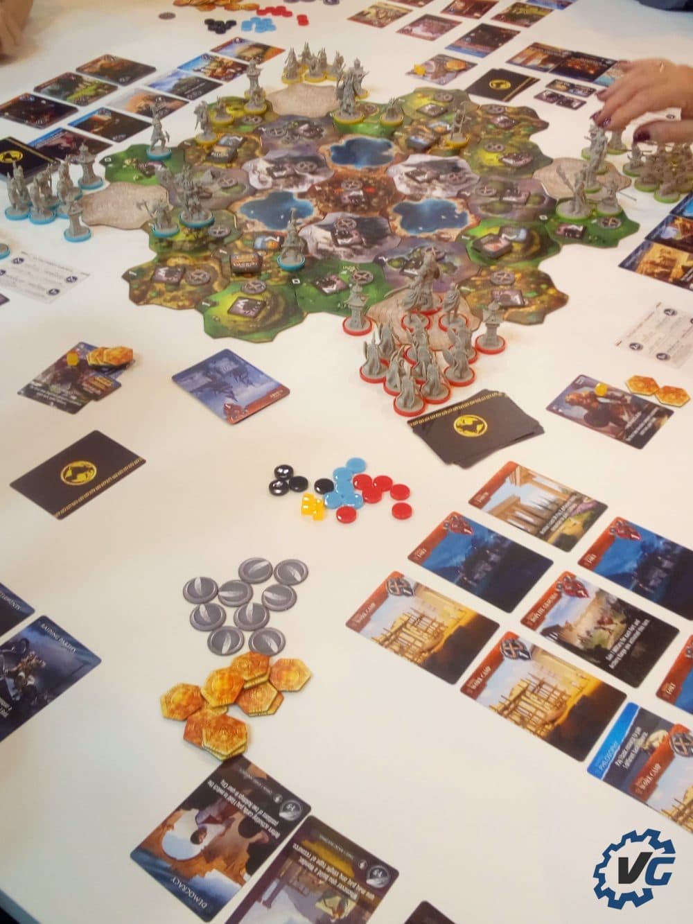 Puisque l’un de mes plus gros coups de cœur socioludiques était le trop méconnu Dawn of Peacemakers, je tenais absolument à traverser les halles d’Essen pour féliciter Sami de Snowdale Design, qui en est l’auteur, illustrateur et éditeur (et d’ailleurs auteur, illustrateur et éditeur de La Vallée des marchands, tout est lié). Il n’est malheureusement toujours pas question de sa localisation, en négociations mais représentant un gros travail, et La Vallée des Marchands 3 pourrait ne pas être proposé en financement participatif avant 2021, parce que Sami doit consacrer trop de temps… à Lands of Galzyr !
