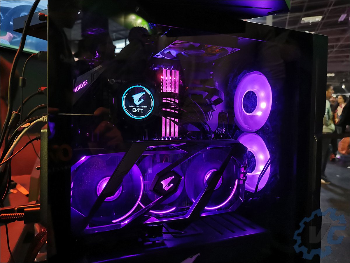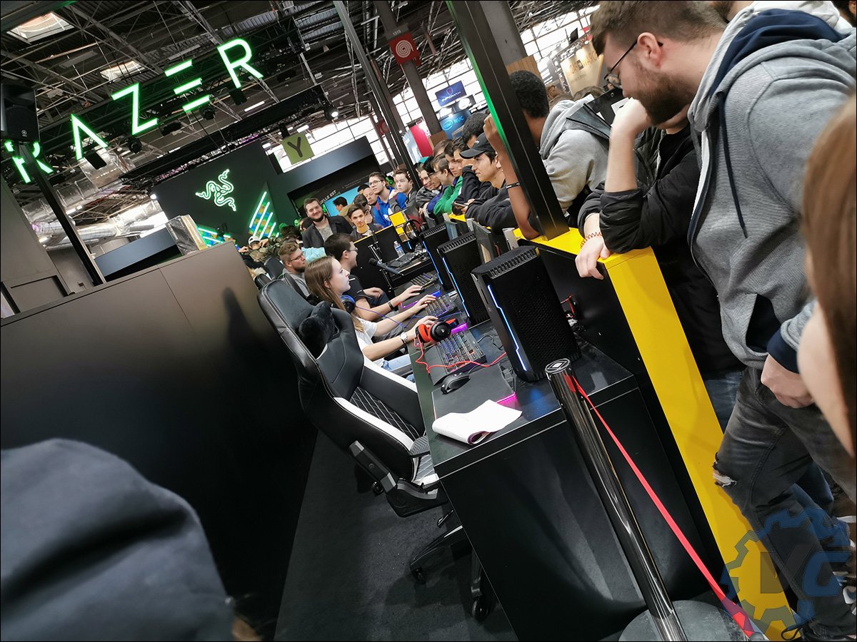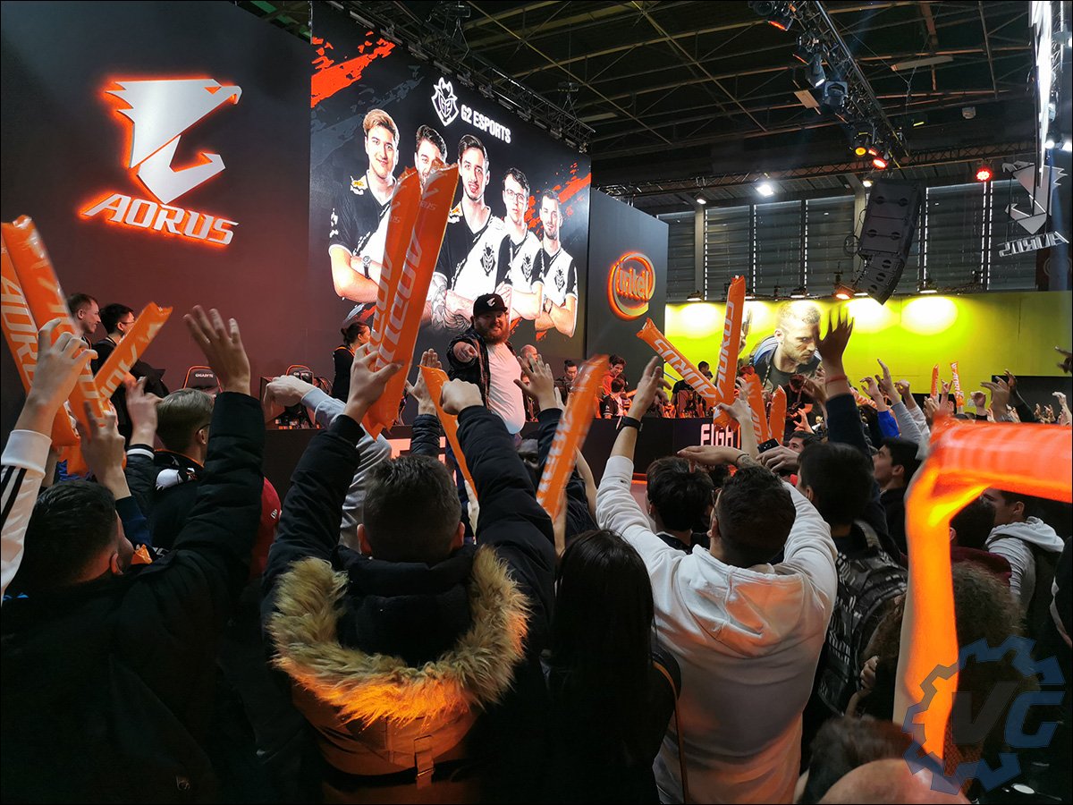 La foule est déjà dense et je m’y fraie un chemin devant le stand de Aorus France. La raison est simple, TED Humoriste est sur scène est entrain de déchaîner le public à coup de goodies. Là aussi, une scène permettait de suivre les exploits de certains gamers associés à des visiteurs choisi au hasard et désireux d’en découdre contre les champions. Je me suis glissé à l’arrière de la scène afin de m’orienter sur la partie « hardware ». Plusieurs configurations étaient en démonstration dont deux notamment bénéficiant du système de refroidissement Aorus Liquid Cooler 280 et chargées de faire tourner une simulation automobile en réalité virtuelle. J’ai aussi enfin pu admirer la superbe carte mère Aorus Xtreme Waterforce Z390 bénéficiant d’un waterblock intégral chargé de tenir au frais le processeur, l’étage d’alimentation ainsi que le chipset ! Aorus ayant fait le bon choix de combiner cette carte mère avec la RTX 2080 Ti Xtreme Waterforce WB (lien de notre article) pour une configuration 100% refroidissement liquide.