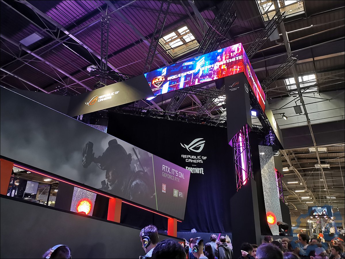Le reste du stand faisait la part belle aux composants de la marque avec notamment un mod bénéficiant d’une carte mère ROG Strix Z390-E Gaming, d’un i9-9900K, d’une Strix RTX 2080 Gaming, le tout dans un boitier ROG Strix Helios. Enfin, une scène assez impressionnante où se sont déroulées notamment, ce samedi, de nombreuses parties de Rainbow Six.
