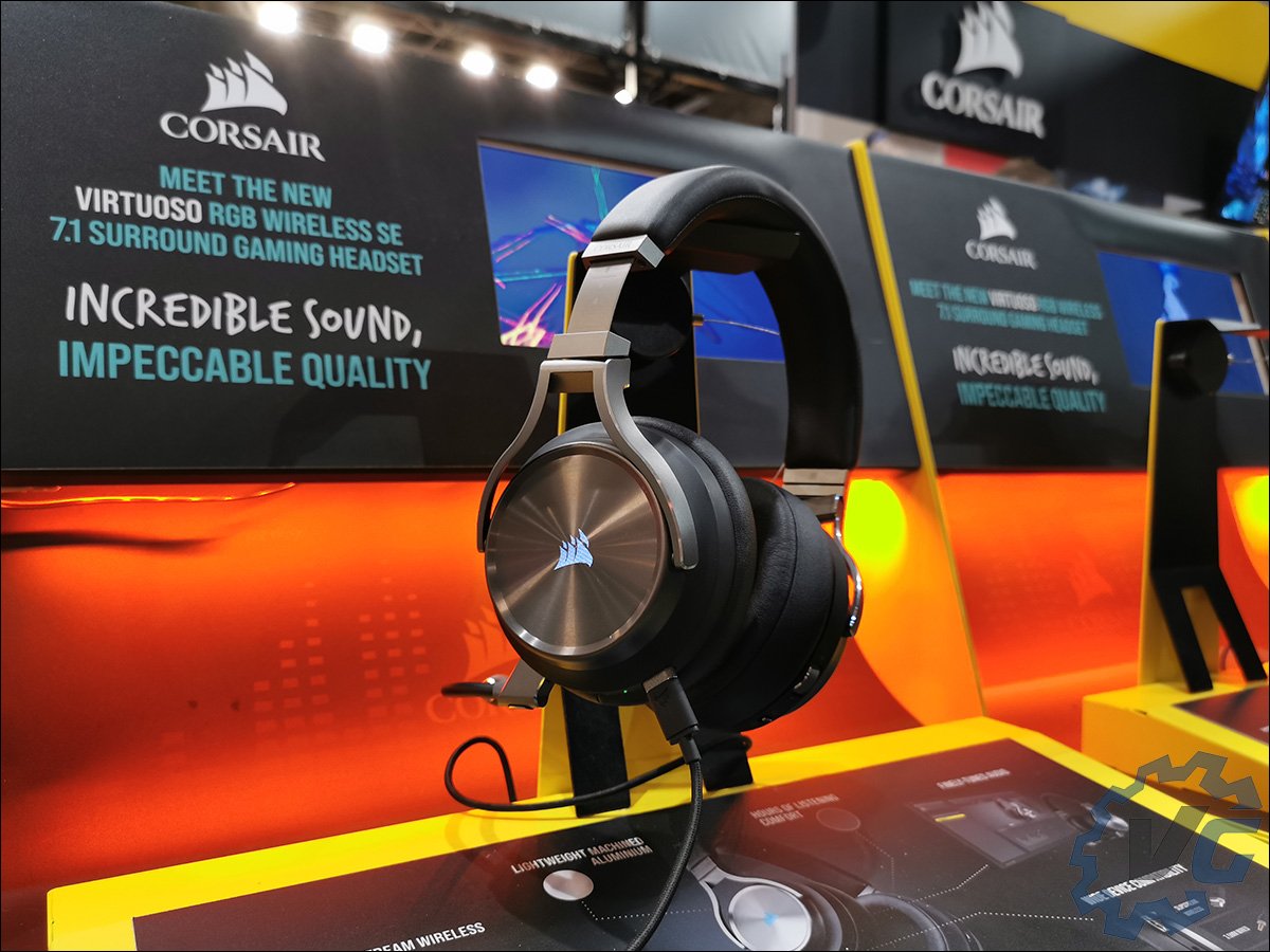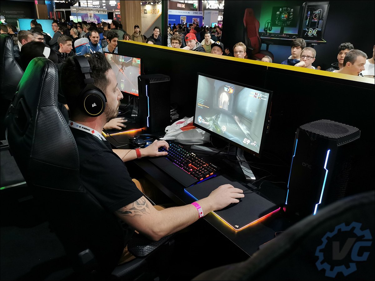 Cette année Corsair partageait son stand avec le magasin Cybertek et offrait ainsi l’occasion aux visiteurs d’acheter directement le ou les produits de la marque qu’ils souhaitaient. On peut dire que c’était une excellente idée vu le nombre de visiteurs faisant la file afin d’acquérir un de leur produit. Corsair a plutôt bien pensé son stand avec une zone dédiée au jeu et qui permettait ainsi de tester notamment les périphériques (casque, souris, clavier, …). Comme vous pouvez le voir, les configurations étaient des Corsair ONE. La zone suivante mettait en avant justement la plupart des périphériques rangés selon leur fonction. On pouvait d’ailleurs retrouver le super casque gaming haute-fidélité VIRTUOSO RGB WIRELESS SE gris acier.