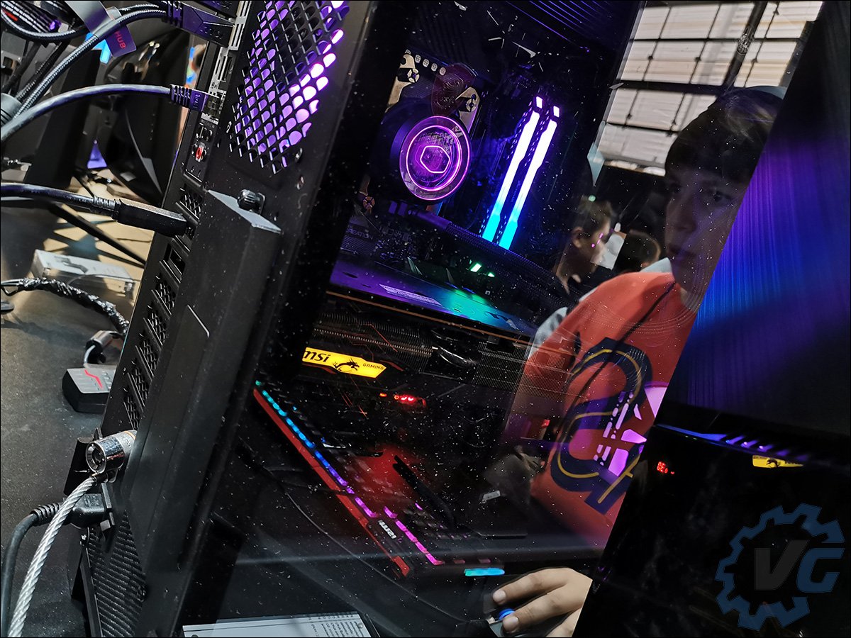Seconde visite de la journée chez MSI France. Le stand de MSI misait avant tout sur une scène permettant d’accueillir pas moins de dix joueurs en même temps, placés par équipe de cinq et face à face. Plusieurs ordinateurs étaient installés afin de mettre en avant certains composants comme le boitier haut de gamme MSI Sekira 500 disponible en trois finitions différentes. Un boitier qui fait la part belle à l’acier, l’aluminium, le verre trempé ainsi qu’au système de refroidissement intégré. Comme je vous le disais, il est disponible en finition de base 500P, 500G avec des liserés dorés et enfin la version 500X qui accueille le RGB. En ce qui concerne son prix, il varie de 209 euros (500P) à 249,95 euros (version 500X).