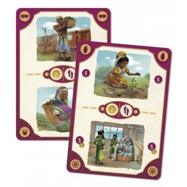 Les cartes Action ont deux côtés, représentant chacun une action : planter, récolter, commercer, engager un conseiller ou développer la technologie. En outre, elles portent systématiquement les deux mêmes actions alternatives, se déplacer pour prendre deux roupies.