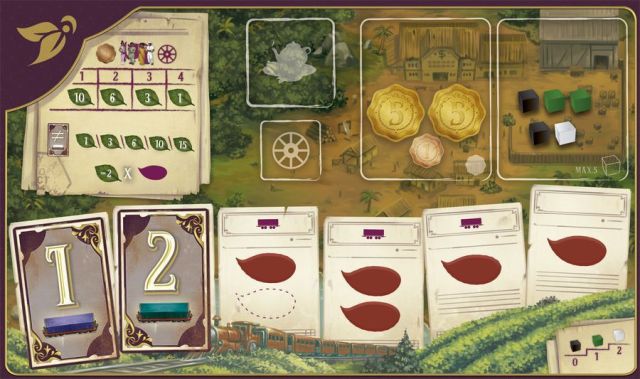 On mélange la pile de cartes Action pour la poser sur l’emplacement correspondant du plateau central, et dont chacun pioche secrètement trois cartes. En outre, les exploitants prennent un plateau individuel, les feuilles de thé de leur couleur (jaune, bleu, rose ou rouge), posées sur les emplacements Contrat de ce dernier, 6 disques de leur couleur, dont l’un est placé sur le 0 de la piste de score faisant le tour du plateau central, 15 roupies placées sur l’emplacement Banque du plateau individuel et une caisse de thé cultivé à basse altitude (un cube noir) sur l’emplacement Entrepôt du plateau individuel.