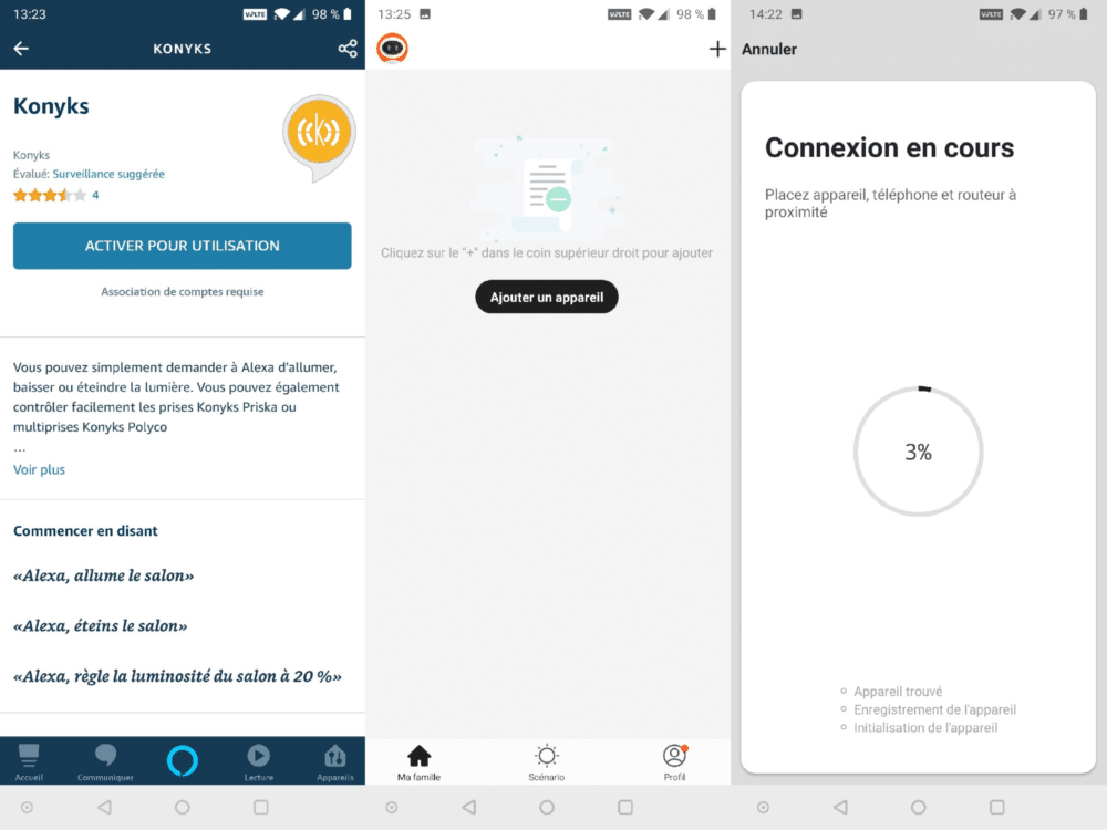 Pour vous connecter à Google Home ou à Amazon Alexa, ouvrez l’application Google Home, puis cliquez sur l’icône « + », configurez un appareil avec Google et choisissez Konyks. Pour Alexa, ouvrez l’application dédiée et recherchez le skill du même nom. Entrez ensuite vos identifiants utilisés pour vous connecter à l’application Konyks.