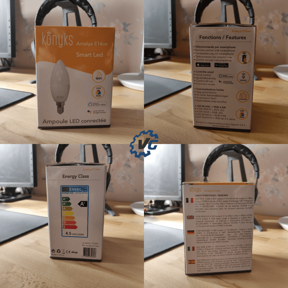 Parlons pour commencer de l’ampoule. Cette dernière nous parvient dans une petite boîte toute simple, comprenant évidemment l’ampoule Antalya E14WR dans notre cas, ainsi que sa notice d’utilisation. Sur le côté droit, on apprend qu’elle est A+ en terme de classe énergétique. À l’arrière, et toujours en cinq langues (français, anglais, allemand, italien et espagnol), nous retrouvons plus de caractéristiques :