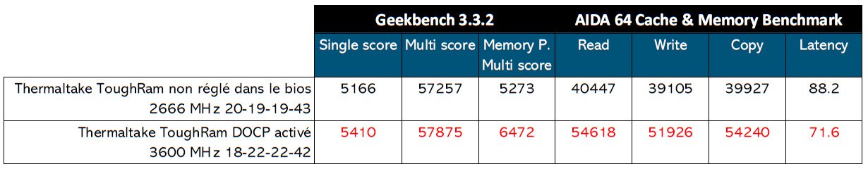 Voici par exemple les résultats du kit Thermaltake n’ayant pas été paramétré dans le bios face au kit où nous avons activé le DOCP dans le bios de notre carte mère Crosshair VIII Impact ! Sans aucun réglage, le kit affiche par défaut une fréquence de 2666 MHz et des timings de 20-19-19-43. Comme vous pouvez le voir dans le tableau, les chiffres parlent d’eux-mêmes ! N’oubliez donc pas d’activer le XMP/DOCP de votre kit mémoire dans le bios.