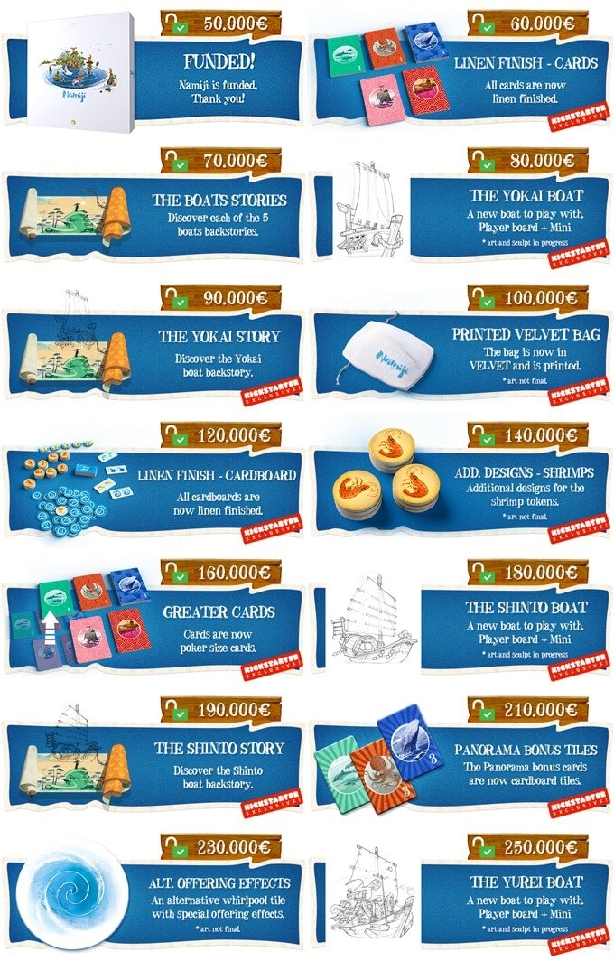 En outre, il faut y ajouter une multitude de Stretch Goals (des paliers de financement) débloquant de nouveaux éléments ou des éléments améliorés, dont certains seront exclusifs aux souscripteurs : un sac en velours au lieu de toile, le navire Yokai, le navire Shinto, le bateau Yurei, des éléments cartonnés au lieu de simples cartes…