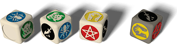 Or chaque couleur n’est représentée qu’une fois par dé, ce qui rend la victoire très improbable… Il faudra compter sur les faces blanches (qui servent de Joker) et surtout sur les équipements, dont le nombre défaussé (toujours de la bonne couleur) inflige autant de blessures, ainsi bien sûr que sur l’étendard et les pouvoirs, et sur les équipements des héros situés sur la même case, seule opportunité de mettre ses forces un peu en commun…