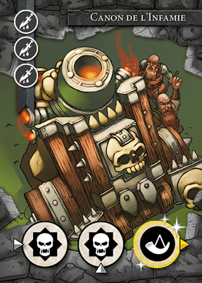 Sur la tuile Bastion Étendard, on place la figurine d’étendard, sur la tuile Bastion Trébuchet la figurine de filet, et sur la tuile Bastion Carrière naine la figurine représentant un wagon d’explosifs.