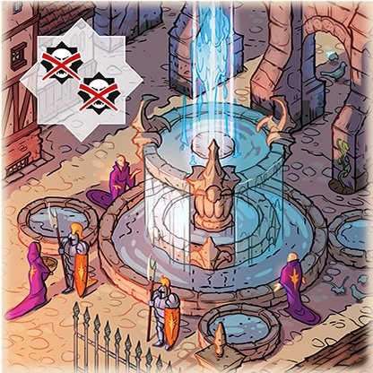 Il faut donc bien exploiter les neuf cases du plateau, dont chacune a naturellement un effet distinct : lancer deux dés pour récupérer les équipements de la même couleur (Marché), placer un étendard sur la figurine d’étendard pour réduire la résistance de tous les monstres de cette couleur d’un point (Étendard), retirer deux figurines Emprise du Mal (Emprise divine), prendre pour n’importe quel joueur un équipement au choix ou ressusciter un Héros, sur son côté blessé cependant (Dispensaire), perdre un point de vie pour tuer un monstre au choix (Tombeau des Rois Anciens), placer la figurine Piège sur un emplacement libre de son plateau Horde pour tuer instantanément le monstre qui y sera posé (Carrière naine), donner un point de vie et un déplacement à un joueur au choix (Taverne), déplacer librement deux monstres (Tour des stratèges), placer le filet sur l’un des effets d’un monstre pour le bloquer (Trébuchet).