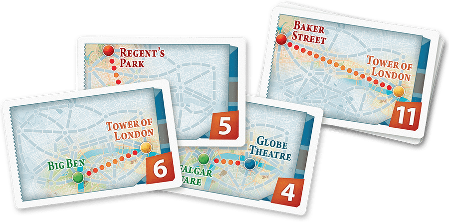 Enfin, chaque joueur reçoit deux cartes Destination, dont il peut défausser l’une s’il ne souhaite pas conserver les deux. Ces cartes représentent deux lieux à relier avec son réseau de transports, y compris avec tous les détours imaginables.