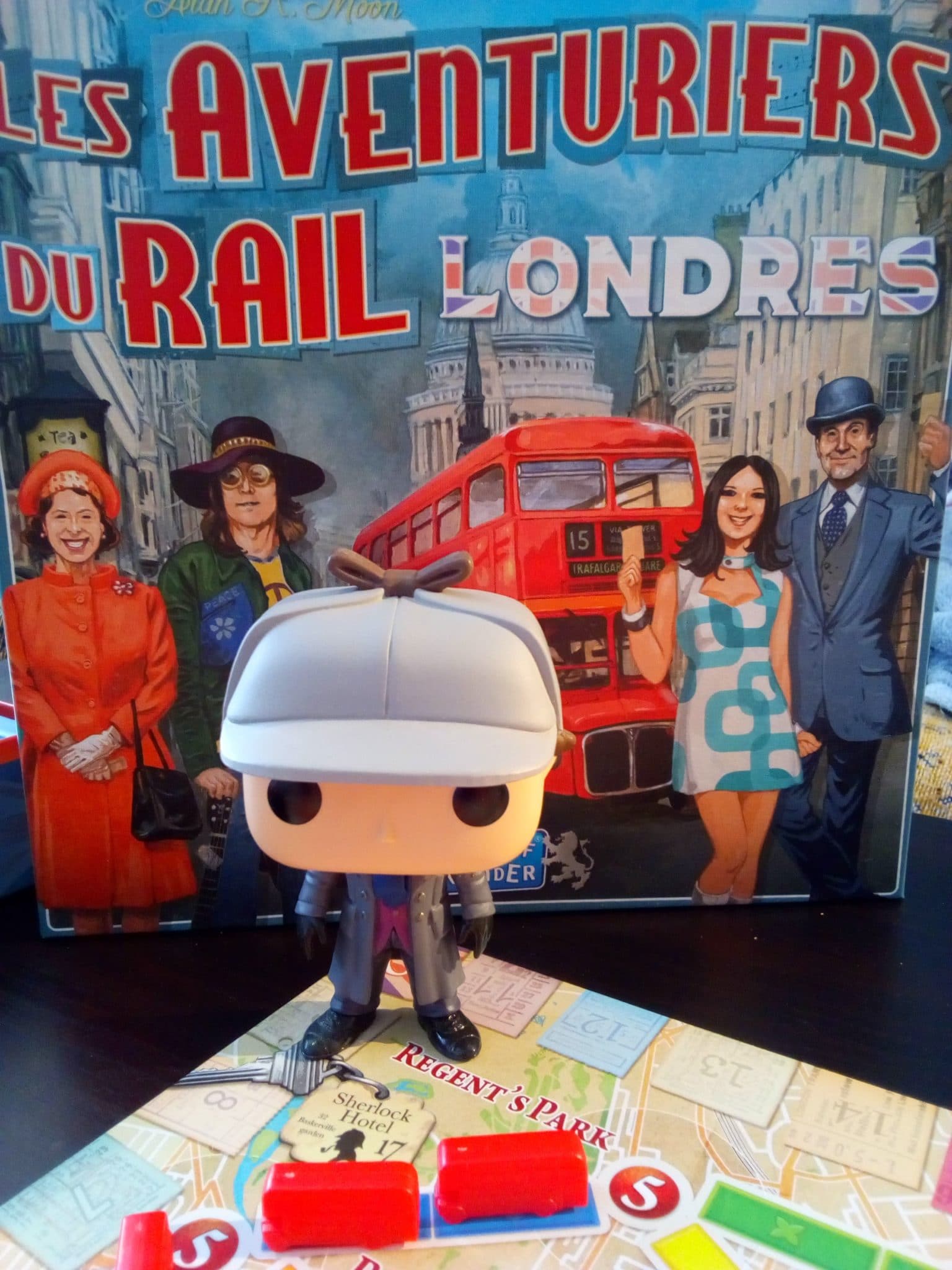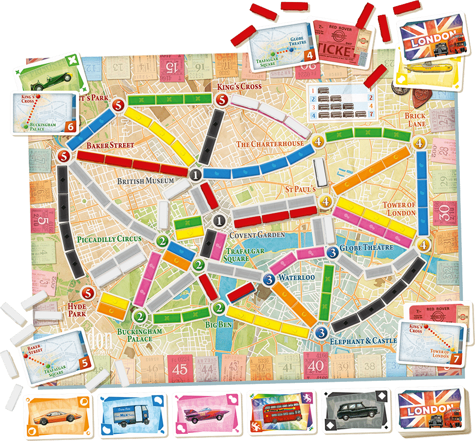 On place donc le plateau, assez grand, très joliment coloré, au centre de la table. Comme toujours avec Les Aventuriers du rail, il est extrêmement lisible, malgré le souci de thématisation (un timbre représentant Elizabeth II dans un coin, une clef du Sherlock Hotel dans un autre ; la fidélité à la géographie de Londres, bien sûr). Au mieux pourra-t-on regretter que certains noms de lieux soient parfois un peu éloignés du point qu’ils sont supposés nommer, notamment Trafalgar Square, Tower of London, dans une certaine mesure Covent Garden. Il n’y a pour autant aucun doute sur le lieu qu’ils nomment, mais il fallait que je pinaille un peu.
