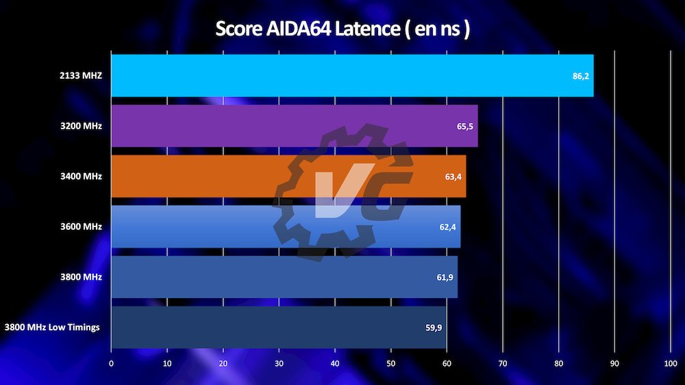 Nous arrivons à atteindre une latence inférieure à 60 ns sur la RAM, un résultat excellent avec un processeur AMD Ryzen. En outre, le voltage appliqué étant une valeur sûre pour utilisation intensive 24H/24H d’après Hynix, des résultats similaires peuvent être attendus sur une plateforme au chipset B450/X470 et X570.