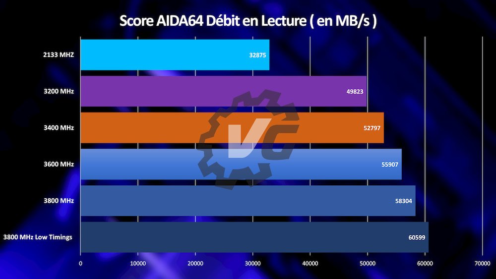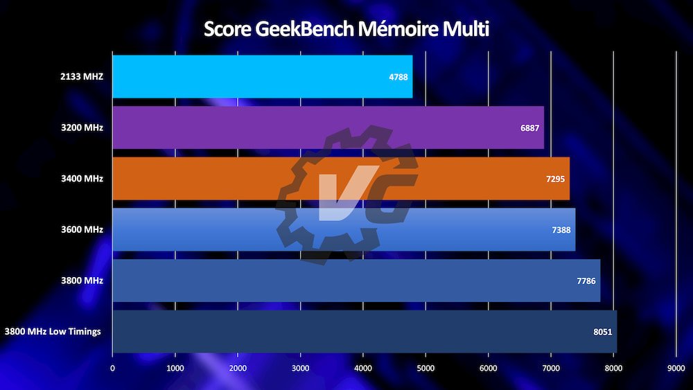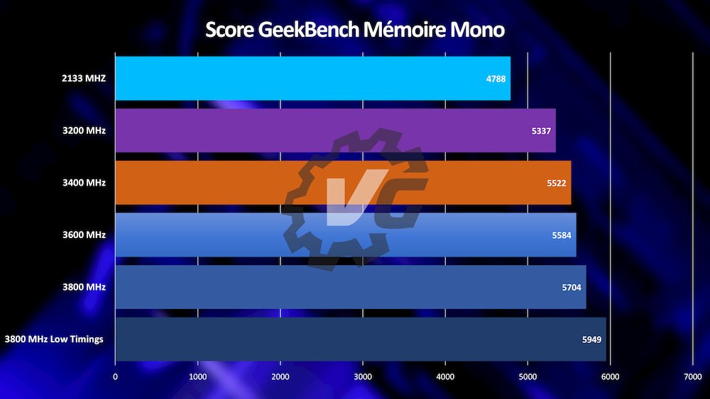 Par la suite, nous avons testé le kit sur les logiciels généraux que sont AIDA64 et Geekbench (64 bits). Chaque benchmark a été effectué 3 fois et une moyenne de score a été faite.