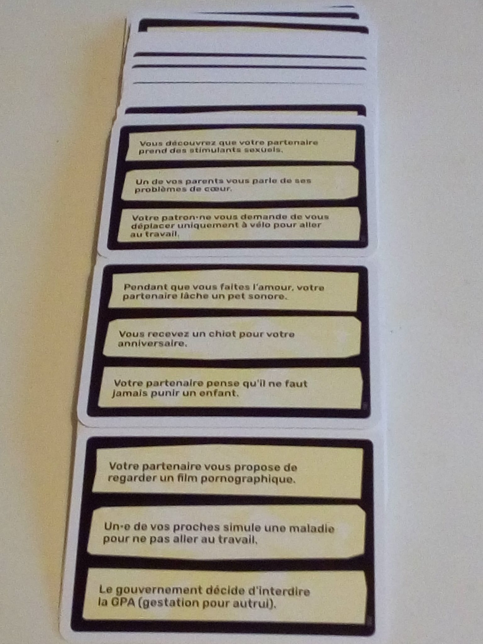 Après Feelinks, développé d’abord pour permettre aux jeunes de communiquer sur leurs sentiments, l’infirmier en pédo-psychiatrie Vincent Bidault développe un opus résolument adulte, déconseillé en-dessous de 16 ans, et à recommander à un groupe assez complice (ou un couple), ne mêlant par exemple pas adolescents et adultes. Ce n’est pas qu’il soit pornographique, il aborde seulement l’intimité assez franchement, et on sait à quel point il peut être gênant pour un enfant comme pour son parent d’être confronté à de l’intime et de se sentir obligés d’en discuter.