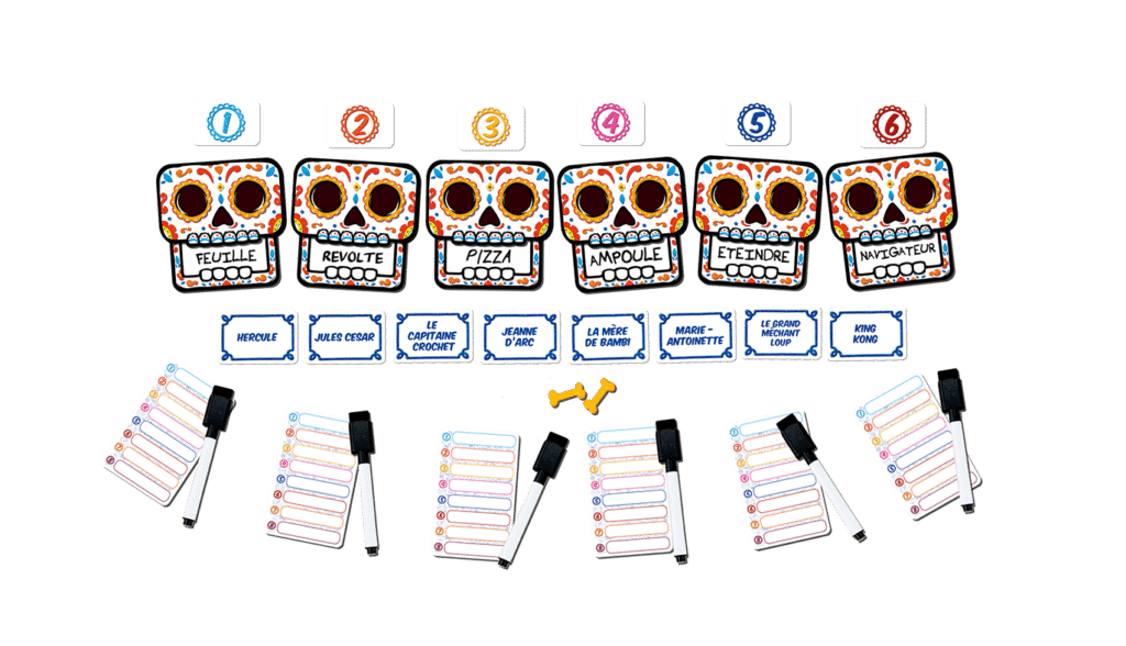 Pour cela, chaque joueur prend l’un des superbes crânes-ardoise et en ouvre la partie supérieure pour y noter secrètement au feutre (inclus) le nom propre qu’il vient de piocher (par exemple « Harry Potter »). Certaines cartes sont assorties d’une étoile, pour indiquer leur accessibilité pour un public jeune, tandis que d’autres sont blanches pour être personnalisées.