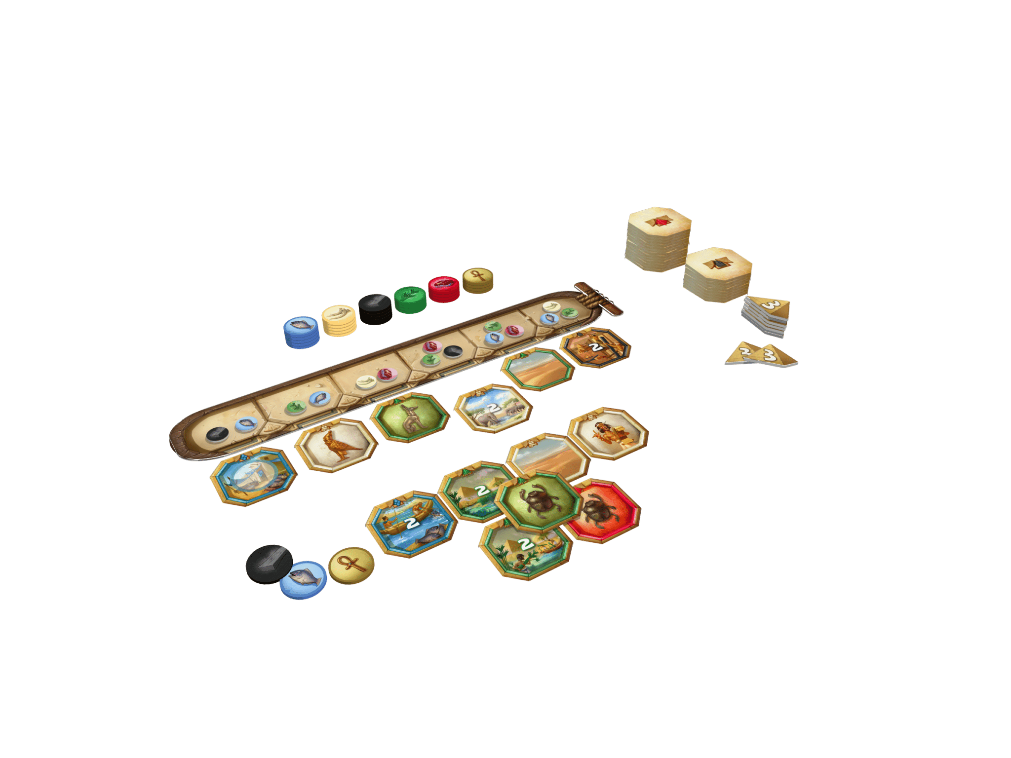 Ces ressources figurent aussi sur les épais jetons en plastique lourd bleus, jaunes, noirs, verts et rouges, que l’on pose en autant de piles près du plateau, en y ajoutant une pile de jetons Ankh.