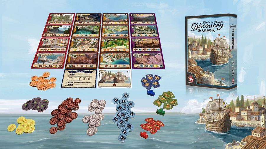 Quatre plus précisément, dont trois seront présentés ici, en commençant par un petit jeu de cartes assez intrigant, me rappelant dans l’idée Celestia ou Multiuniversum, sur un thème (abstrait) de conquête maritime : Discovery – L’Âge des découvertes, conçu par les Japonais d’A.I.Lab., ilustré par Ururi et Shih-fen, destiné à 2 à 4 navigateurs de 10 ans et plus pour des parties d’environ 40 minutes et vendu 20 euros.