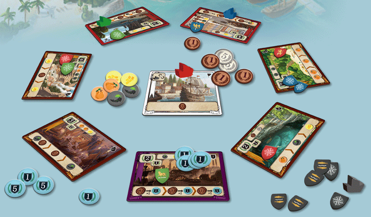 On pioche 4 des 8 cartes Île productrice (à condition qu’elles produisent bien les trois ressources du jeu, sinon on les repioche), 2 des 4 cartes Île commerciale et 1 des 4 îles culturelles (avec 10/15/20 jetons 1PV pour 2/3/4 joueurs) afin de les placer aléatoirement en cercle autour le l’île voisine, face visible. Les cartes non utilisées sont remises dans la boîte, garantissant une jolie rejouabilité à Discovery.