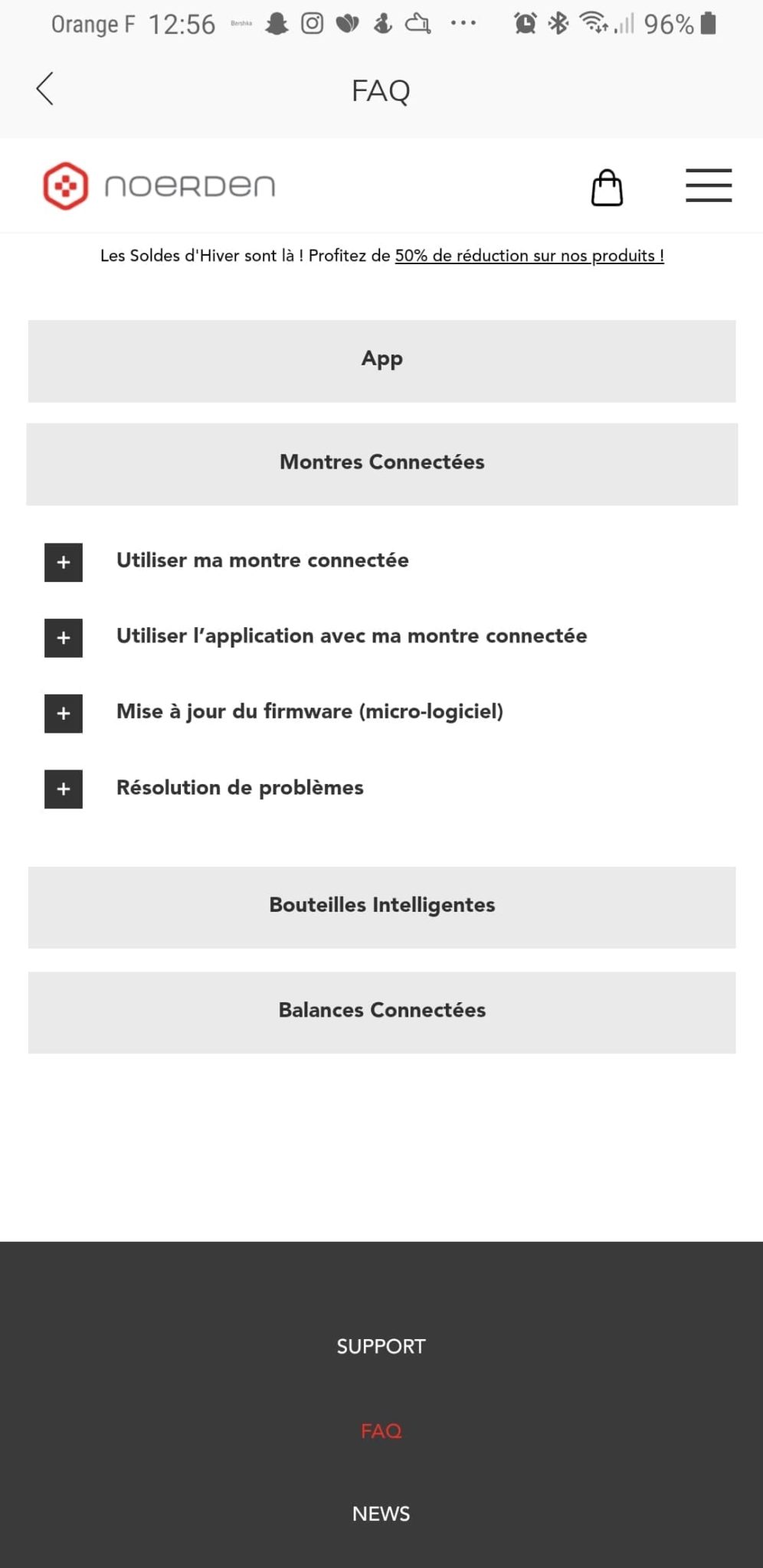 Je reviens plus en détail sur la partie Paramètres. Il s’agit là d’une partie de l’application très complète et très bien rédigée. Je tiens à insister sur la sous-section FAQ que j’ai trouvée efficace, claire et pertinente. Elle m’a beaucoup aidée dans la prise en main de l’appareil, puisque j’adore vraiment être guidée lorsque je reçois un appareil connecté qui possède de nombreuses fonctions afin de rendre mon expérience à la fois agréable mais aussi complète. Traitant à la fois de l’application, des fonctionnalités des appareils connectés (montre, balance, bouteille), elle s’attarde à juste titre sur la prise en main initiale (connectivité, démarrage), sur les possibilités de la montre (utilisation du bouton, les fonctionnalités, etc), mais aussi sur les problèmes que l’on peut rencontrer avec pour la plupart une solution claire.