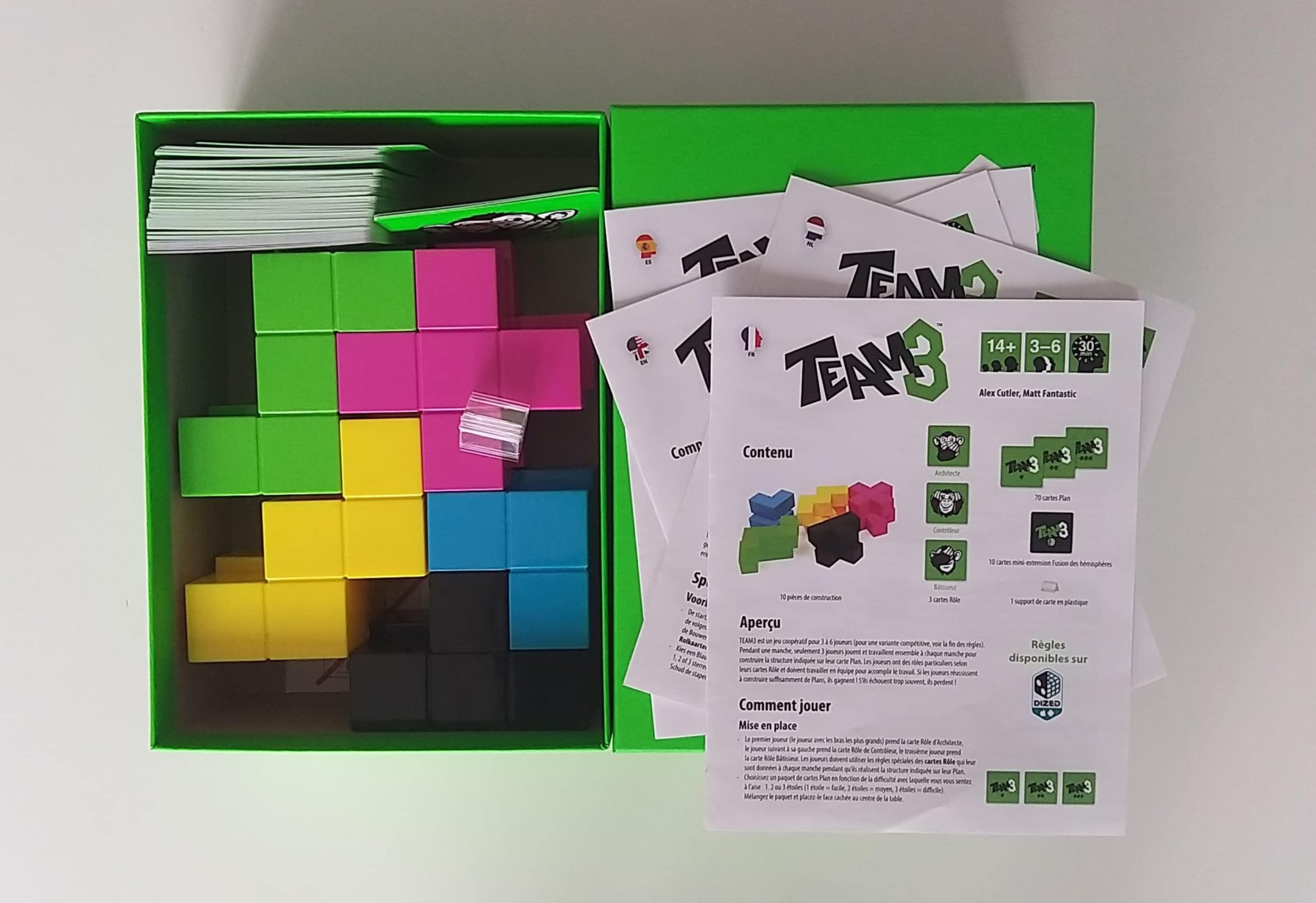Il existe la possibilité de jouer en équipe de 3 contre 3 minimum où deux Architectes s’affrontent sur la même carte Plan de niveau 1, après s’être partagé les pièces de construction (cinq pour chaque équipe). Au bout de 6 manches réussies, l’équipe concernée gagne. À savoir, si vous possédez deux jeux TEAM3, vous pouvez d’ailleurs faire s’affronter les deux équipes avec 10 pièces de construction pour chacune.