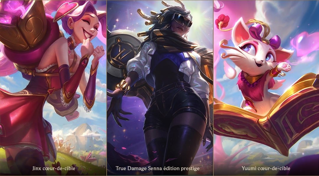 Nous l’attendions avec impatience, et c’est ce patch 10.3 qui nous offre les visuels attendus. Senna nous en met plein la vue avec un skin True Damage édition prestige, de toute beauté. Dans un tout autre style, Jinx et Yuumi se parent des couleurs de la Saint-Valentin et débordent d’amour dans des skins Coeur-de-cible. De nombreux chromas iront avec ces skins autant pour Jinx que pour Yuumi. Vous pouvez cliquer sur les noms des champions pour trouver les skins en grand format.