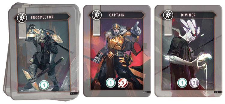 Chacune des deux maisons reçoit d’abord un deck de base constitué de huit prospecteurs, un devin et un capitaine. Oui, on commence petitement dans Volfyirion, mais en possédant déjà la main-d’oeuvre minière pour nourrir économiquement ses ambitions !