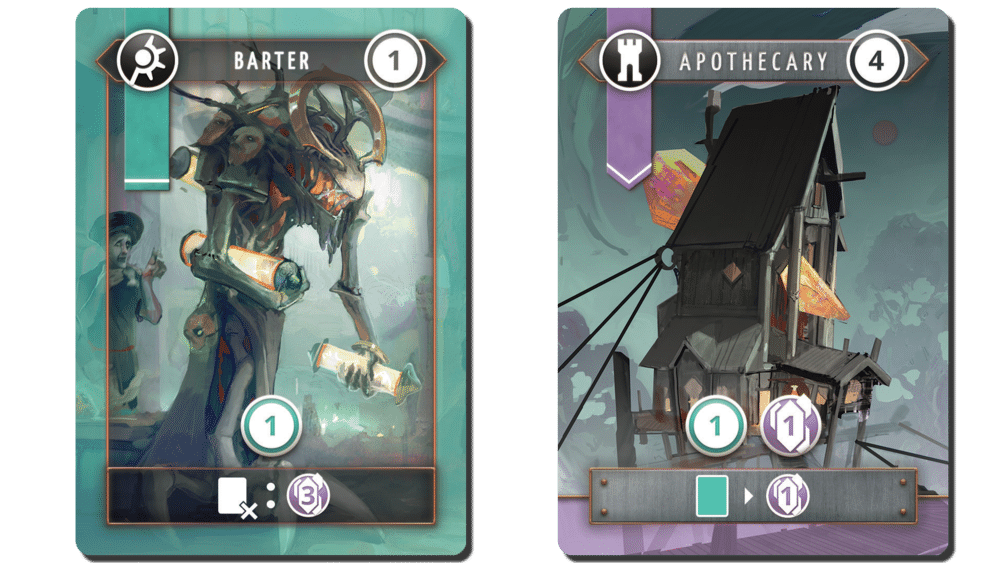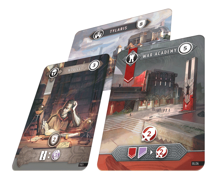 - On peut activer la capacité secondaire d’une carte (en plus d’en activer la capacité primaire bien sûr). Les cartes ont toute la bannière d’une maison mineure, verte, violette, rouge ou neutre/grise. Certaines cartes ont pour capacité secondaire des Chaînes synergiques, c’est-à-dire que l’on a besoin de cartes représentant les bonnes bannières (en dehors de la carte activée) dans son aire de jeu pour obtenir un bonus. D’autres cartes ont une capacité de Retrait : elles peuvent être simplement retirées du jeu pour profiter de leur bonus et évidemment rétrécir le deck, donc augmenter la probabilité de les piocher. Parmi ces effets, la pioche d’une carte, le retrait d’une carte du jeu, la destruction d’une troupe ou d’un bâtiment adverse, le déplacement de Volfyirion.