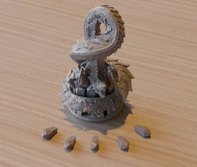 L’extension de Volfyirion comporte avant tout une immense figurine du dragon éponyme, haute de 12 centimètres, Dans son socle sont incrustés cinq fragments numérotés entre 1 et 5, que l’on peut ôter et donc répartir aléatoirement.