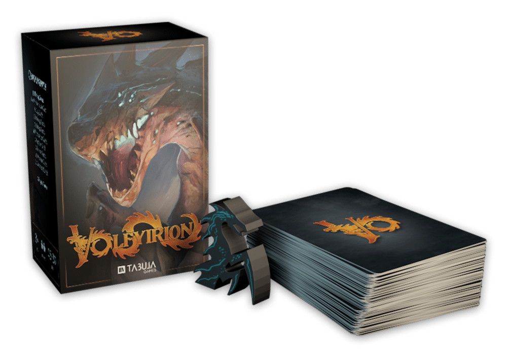 L’éditeur italien Tabula Games doit principalement sa réputation à l’univers majestueux qu’il développe à travers plusieurs jeux indépendants connaissant un grand succès sur KickStarter, Mysthea, Mysthea : The Fall, Icaion, et entre ces deux jeux de figurines, le jeu de deck-building en duel Volfyirion. Je le disais il y a quelques jours à peine, le deck-building (qui consiste à laisser commencer tous les joueurs avec le même deck basique pour le personnaliser et l’améliorer en cours de partie) est sans doute ma mécanique préférée par sa capacité d’immersion et l’impression de progrès individuel qu’elle suscite, en particulier dans les jeux où ce progrès fait sens (Hogwarts Battle, Aeon’s End, God of War, Clank, évidemment La Vallée des Marchands). Or sauf subtilités (comme dans le DC Deck-building game), c’est souvent à deux joueurs que le deck-building compétitif est le plus équilibré et le plus tendu. Donc un deck-building en duel avec un univers fort avait tout pour me plaire !
