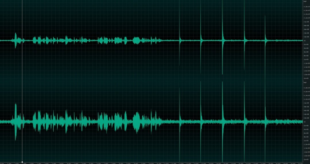 On voit sur cette prise de son une différence assez significative entre l’Exxo et le microphone du casque. Le premier présente une courbe plus « nette », prenant moins en compte les bruits extérieurs. Par la suite, les claquements de doigt sont captés globalement moins fort par l’Exxo qui grâce à sa prise de son cardioïde limite les sons parasites, qui ne viennent pas directement par l’avant du micro. Le volume des sons capté est plus important du côté du casque Logitech, justifié en partie par sa proximité avec la bouche mais également par l’absence complète de filtre quelconque. On remarque que la prise de son cardioïde est assez bien respectée, le pic s’effaçant assez vite, malgré la force du claquement de doigt. Pour des sons plus faibles la différence de prise de son est encore plus nette et ainsi on capte bien moins les touches du clavier, qui pourraient gêner les gens avec qui nous serions en conversation !
