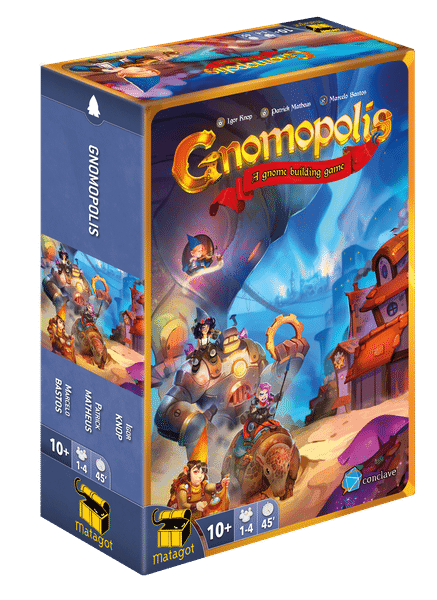Gnomopolis est un jeu d’Igor Knop et Patrick Matheus (Masmorra), illustré par Marcelo Bastos (The Towers of Arkhanos), édité par les Brésiliens de Conclave Editora et localisé par Matagot (Cairn, Kemet, L’Île au trésor, Meeple Circus, Inis, Root…). Vendu 35 euros à peine, il s’adresse à 1 à 4 joueurs de 10/12 ans et plus pour des parties d’environ 45 minutes.
