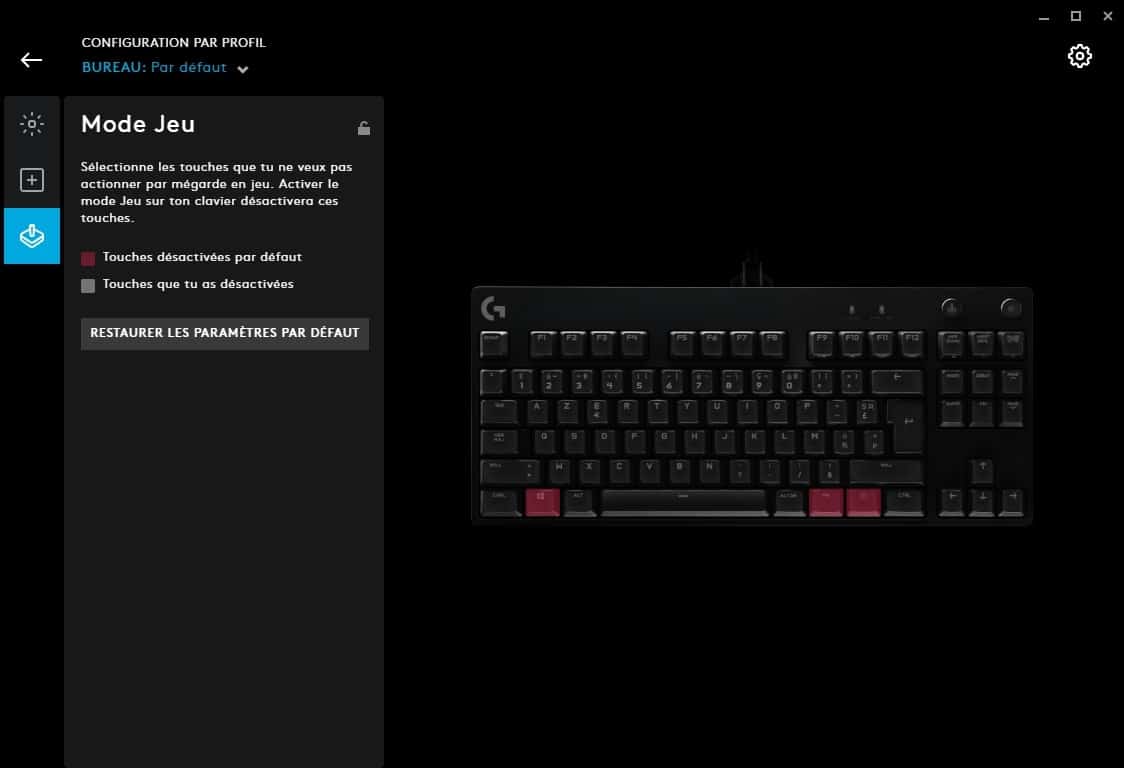 Le logiciel G HUB est un logiciel assez complet qui permet de paramétrer différents profils d’éclairage (selon si vous êtes sur votre bureau ou en jeu). Il pourra d’ailleurs détecter le changement de profil tout seul, pour les différents jeux proposés : Rocket League, League of Legends, Overwatch, etc… Libre à vous de déterminer des profils visuels différents (grâce à l’onglet Lightsync), d’exclure certaines touches (utiles pour certains types de jeu, en activant le Mode Jeu directement depuis le clavier), d’affecter des raccourcis d’actions ou des commandes complexes aux 12 touches F programmables (depuis l’onglet Affectations). Une très grande quantité de possibilités qui va séduire les plus curieux d’entre nous !