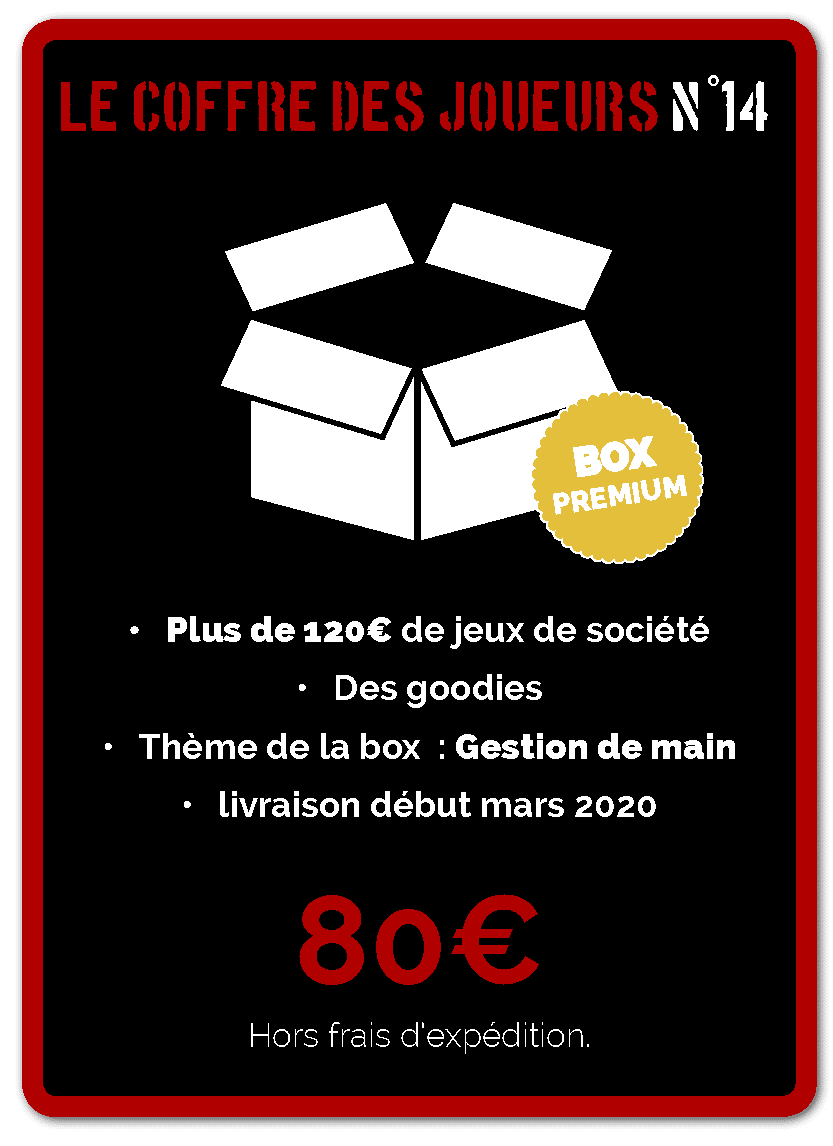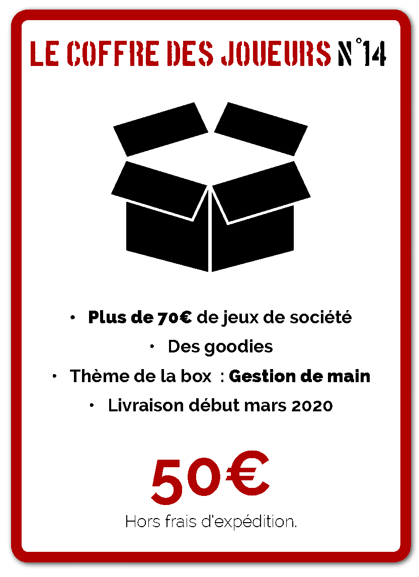 Il ne vous reste qu’une semaine pour la commander, puisque ce quatorzième Coffre des joueurs sur la gestion de main sera livré vers la mi-mars. Pour rappel, il se décline en deux formules, « normale », avec 70 € de contenu en jeux de société, sans compter les goodies, pour un prix de 50 €, et « premium », avec 120 € de contenu pour un prix de 80 €.