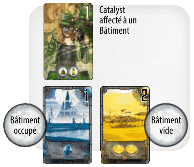 Si vous avez un bâtiment vide devant vous, c’est-à-dire occupé par aucun Catalyst, vous devez obligatoirement y placer au-dessus votre Catalyst nouvellement recruté. Si vous avez plusieurs bâtiments vides, vous avez le choix de celui que vous choisissez d’occuper. Chaque Bâtiment ne peut évidemment abriter qu’un seul Catalyst à la fois et un Catalyst ne peut passer d’un Bâtiment à un autre. Si vous n’avez pas de Bâtiment vide ou pas de Bâtiment tout court, vous laissez alors le Catalyst seul dans votre zone de jeu.