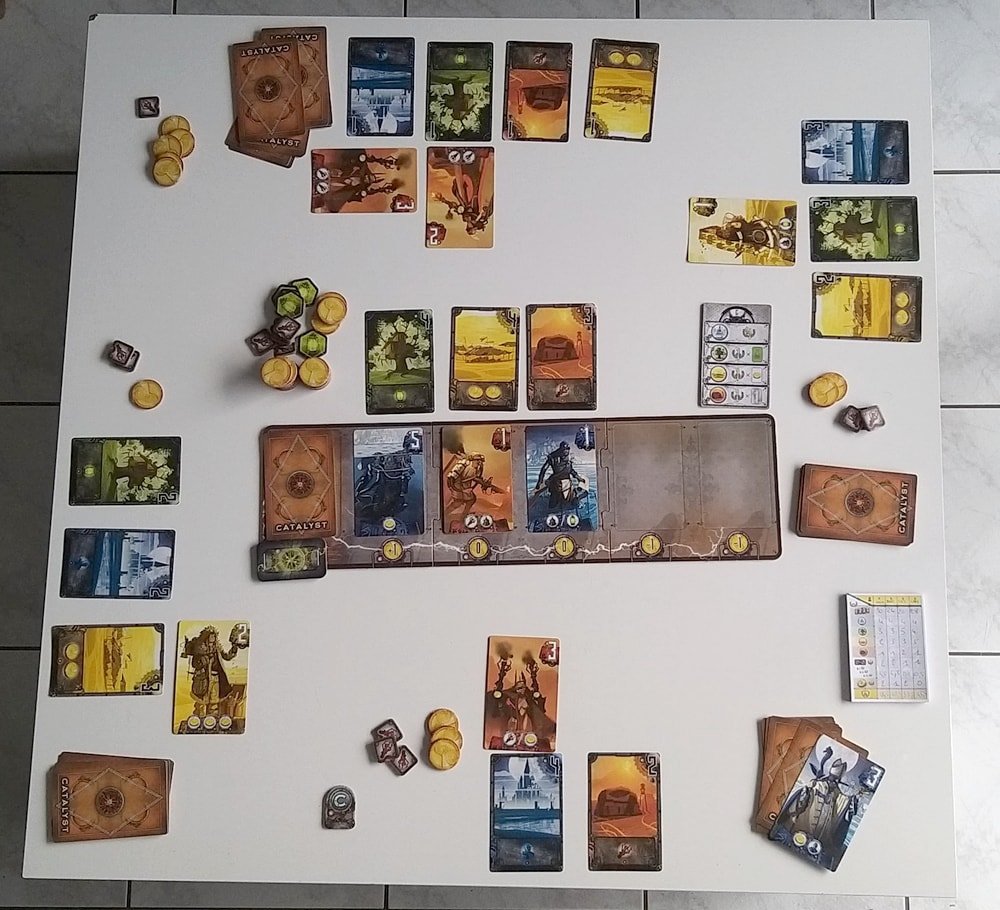 Avant la première partie, il est nécessaire de détacher toutes les petites pièces de leur support. Ensuite, vous devez assembler le plateau de jeu et le placer au milieu de la table. Vous séparez ensuite les cartes en fonction de leur dos, autrement dit selon s’il s’agit de cartes Catalyst, Bâtiment ou Objectif.