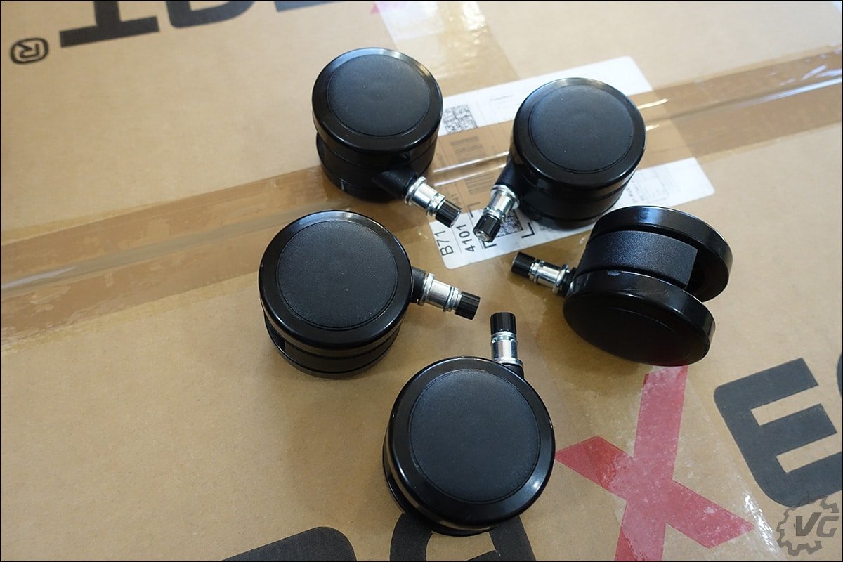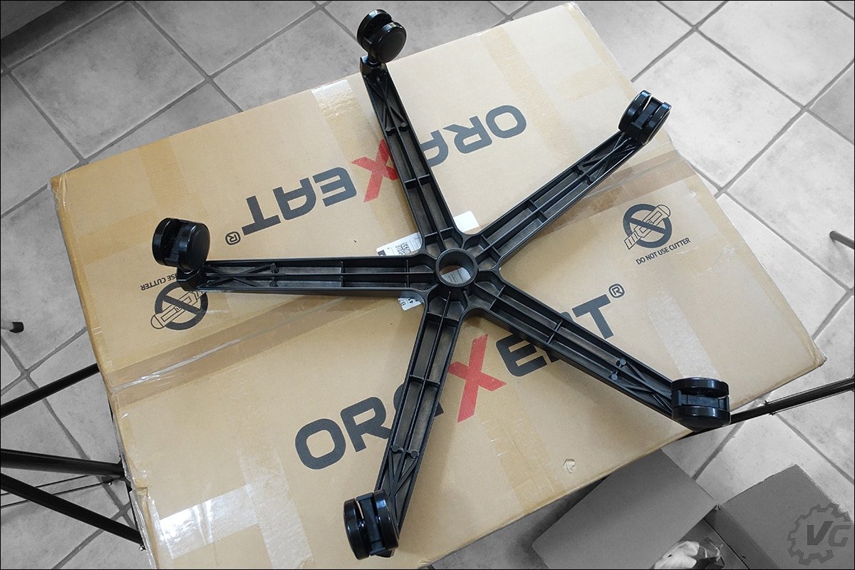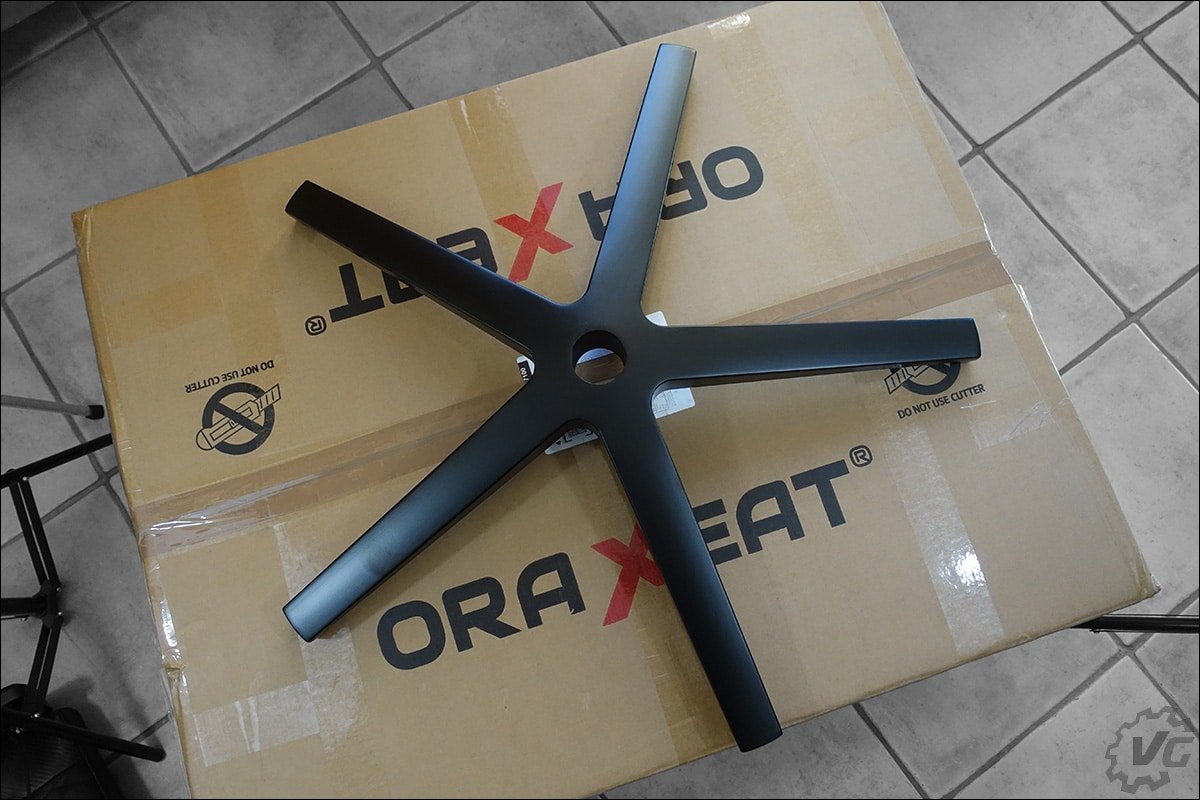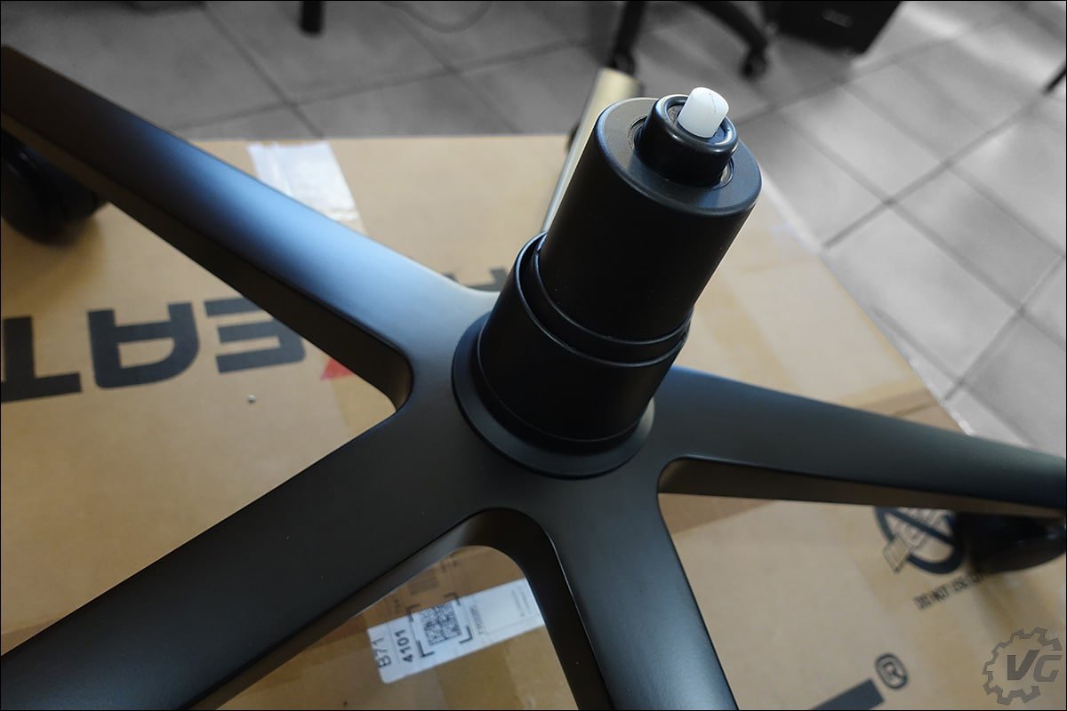 D’un premier abord, cela peut sembler compliquer d’assembler les différents éléments d’un siège gaming, mais ce n’est absolument pas le cas ! Oraxeat vous facile grandement la tâche en plaçant déjà les différentes visseries aux bons endroits. La première étape va consister à assembler la partie basse, c’est-à-dire le support de notre MX850. Pour se faire, il suffit, dans un premier temps d’insérer les 5 roulettes sur le support étoilé. Une simple pression et elles sont mises en place. Ensuite, insérer le vérin de classe 4 dans la partie centrale et de glisser le cache plastique afin de le dissimuler. Et voilà, le montage de la première partie de notre siège est à présent terminé.