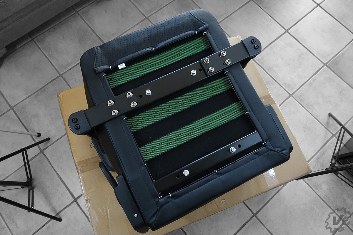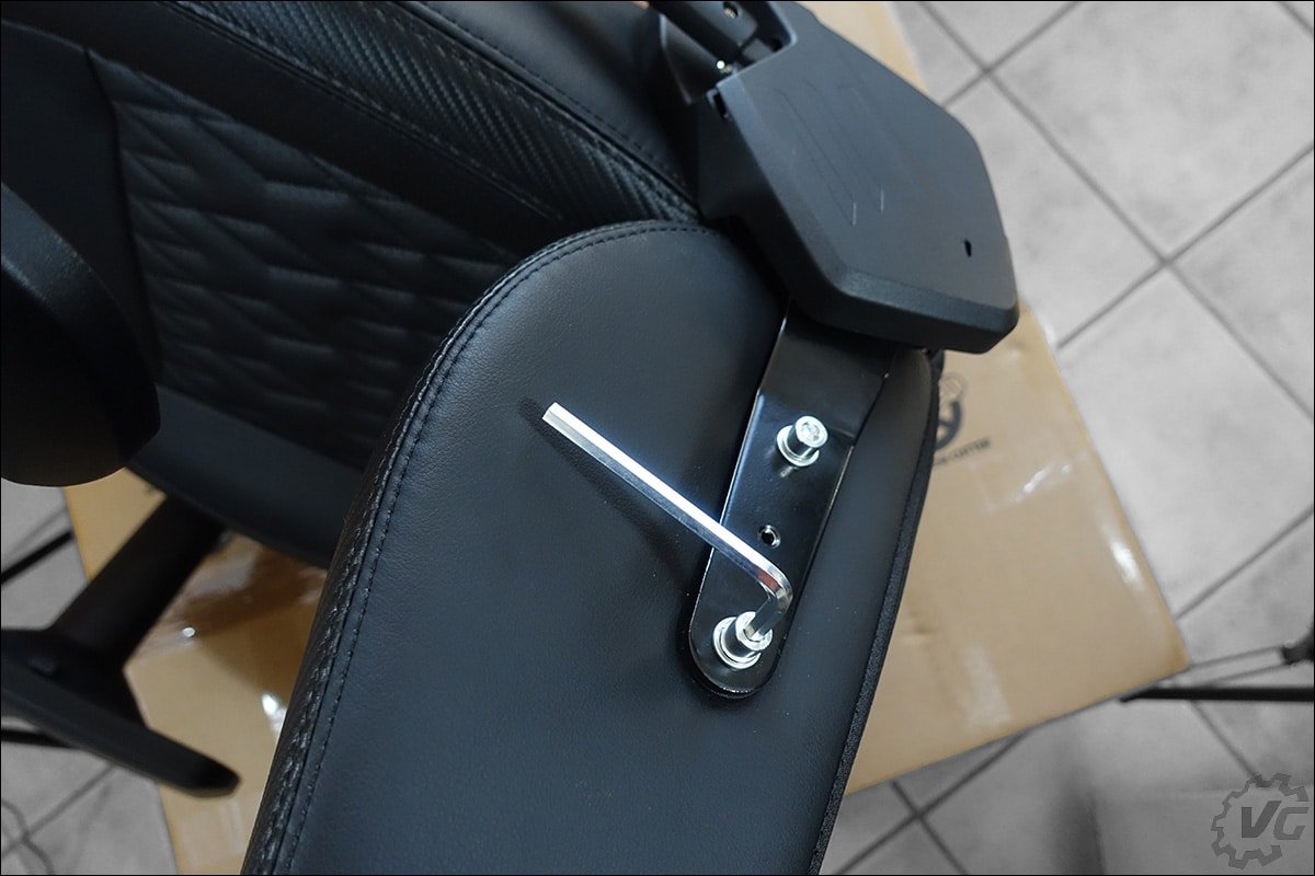 La seconde étape va être d’associer le dossier et l’assise de notre fauteuil. Comme je l’ai dit plus haut, pas besoin de chercher après la visserie, elle est déjà pré-vissée. Dans un premier temps, il va falloir retirer les vis pré-montées sur l’assise, à la main ou en vous aidant de la clé Allen fournie. Retirez les housses de protections des supports en métal de l’assise et venez glisser le dossier afin de faire correspondre les trous. Petit conseil, placez les quatre vis, deux de chaque côté, sans les serrer. L’idée est de bien positionner le dossier avant de les serrer progressivement. Si vous avez l’occasion de bénéficier de l’aide d’une seconde personne, ce n’est pas négligeable. Personnellement, j’étais seul, et je n’ai pas rencontré de difficultés particulières. Une fois les deux éléments réunis, placer de part et d’autre le cache de protection et de finition.