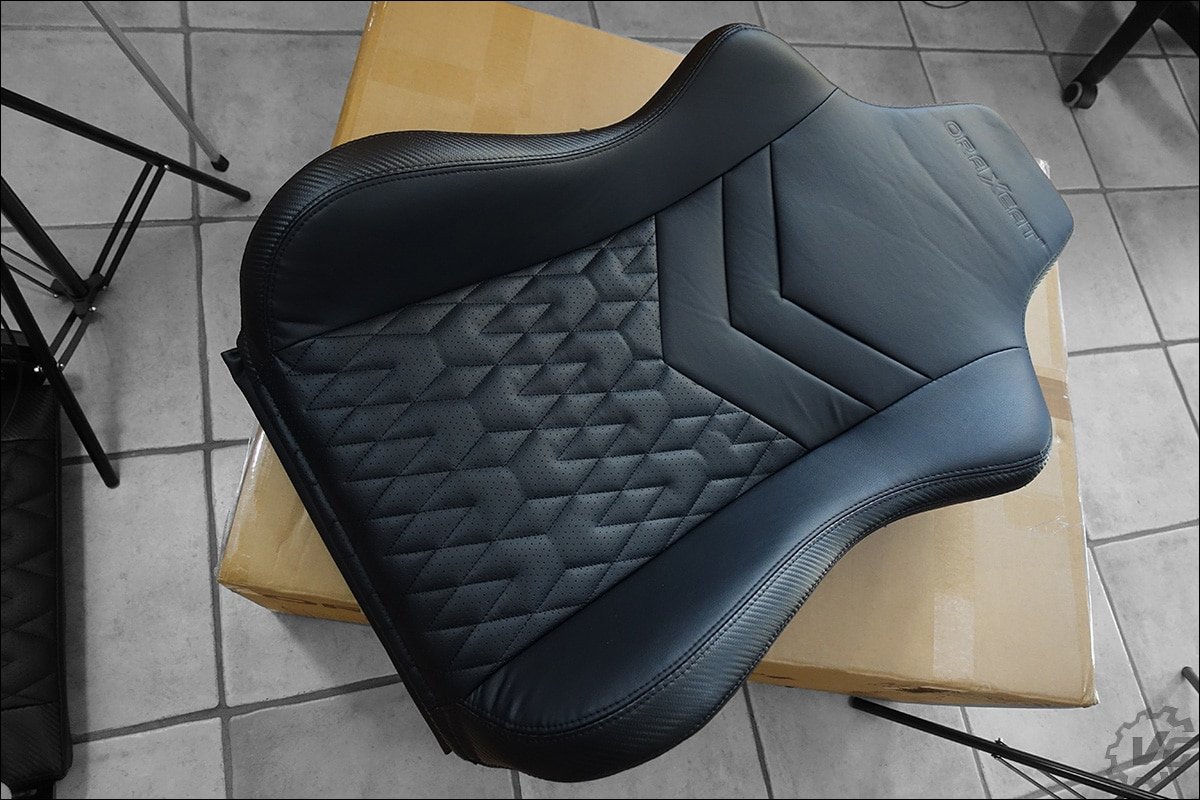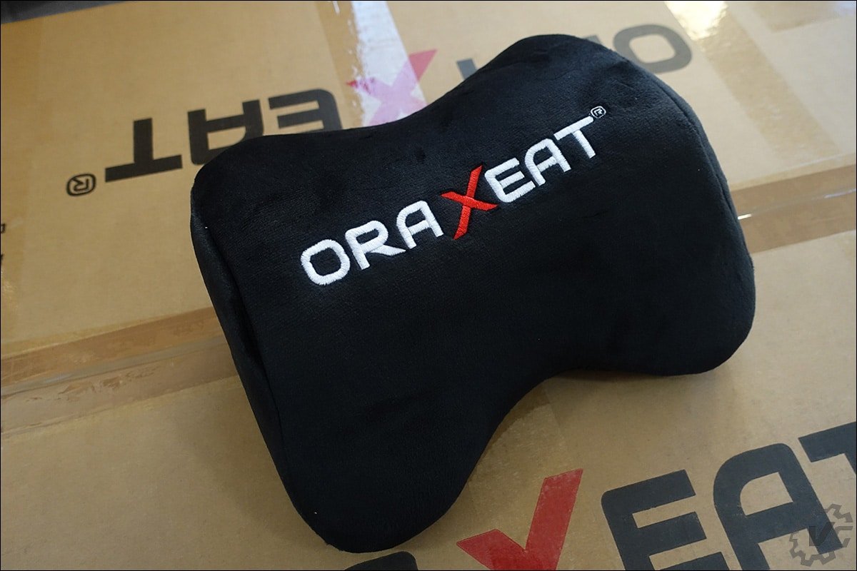 Au niveau de la finition, nous sommes sur du simili-cuir perforé au niveau de l’assise et du dossier. L’idée étant d’éviter un échauffement au niveau du fessier et du bas du dos. La mousse employée est en 65 kg/m3 ce qui assure un confort parfait. Comme je l’ai dit lors de l’introduction, les finitions Oraxeat sont présentes sous la forme de losanges brodés sur l’assise et le dossier. La couleur du fil des sur-piqûres dépendra de celle choisie lors de votre commande. Sur le haut du siège, que ce soit sur la face avant ou arrière, on retrouve le nom Oraxeat marqué à chaud. Enfin, pour terminer, vous aurez l’occasion d’ajouter un coussin de tête et un coussin lombaire conçu avec une mousse à mémoire de forme dans une housse en velours lavable.