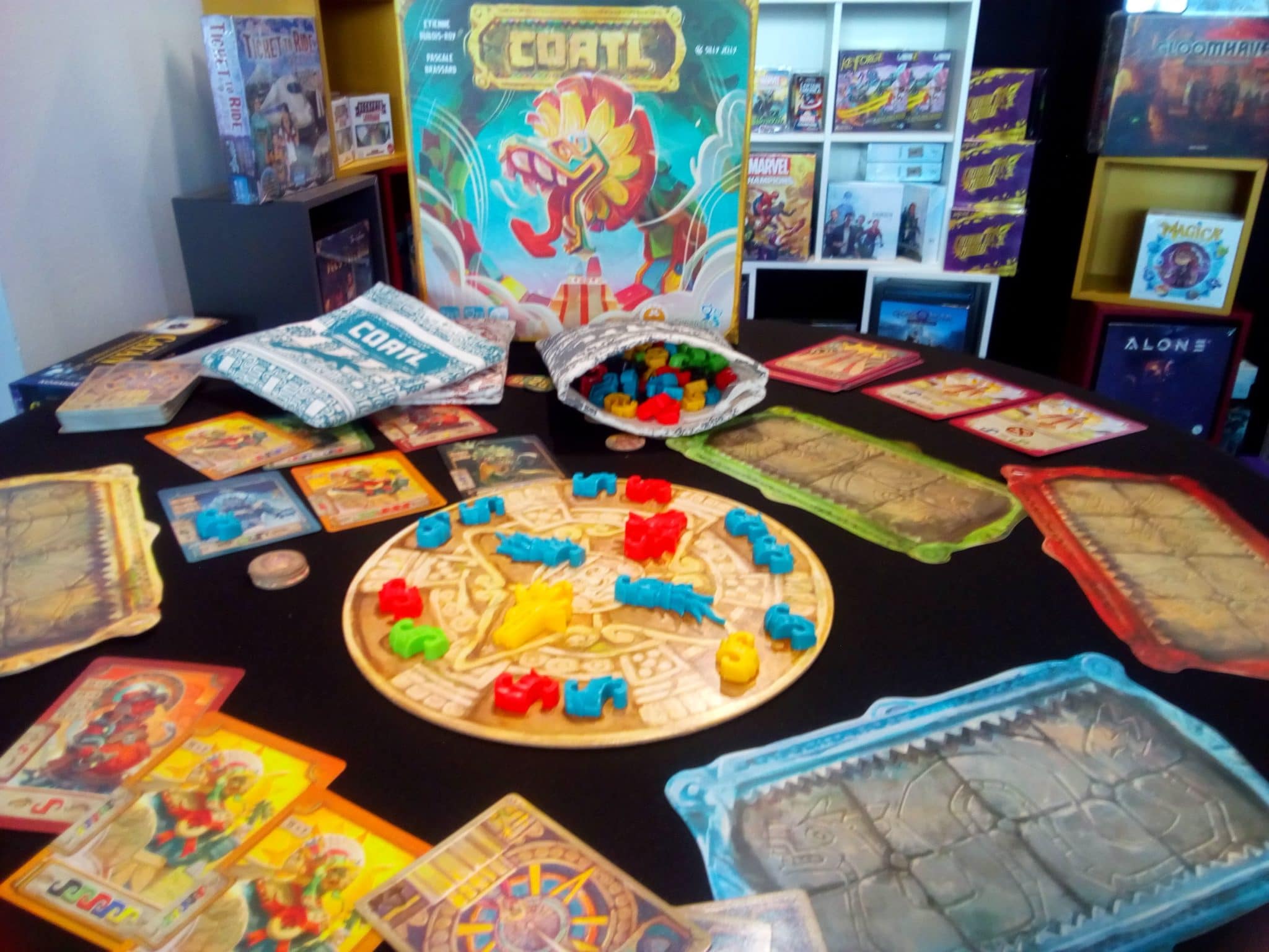Entre la dernière mouture spatiale de ZombicideDark Side, avec l’extension Black Ops, l’imposant Cthulhu: Death May Die, Alone, que Horrible Guild me décrivait à Essen dans les termes les plus excitants, et une vingtaine d’autres, le regard se perd, et heureusement José insiste sur quelques titres dont j’ai moins entendu parler, le très joli Via Magica, un Augustus light illustré par la fine fleur du dessin de jeu de société (Biboun, Chaussy, Djib, Torres, Mafayon…), Eminent Domain, un vieux jeu de deck-building en 4X enfin localisé, le délirant Catan Voyageurs galactiques, beaucoup trop grand et trop gros et forcément assez irrésistible, l’intrigant petit Fallout Shelter, tout juste reçu et déballé avec lui, Coatl, le troisième jeu de Synapses Games étonnamment fidèle à la culture aztèque pour un jeu de construction de dragons/serpents multicolores, et donc aussi attirant pour son côté puzzle tactique que pour son originalité thématique (ai-je dit que j’étais très amateur de cultures mésoaméricaines ? et sa qualité éditoriale)…