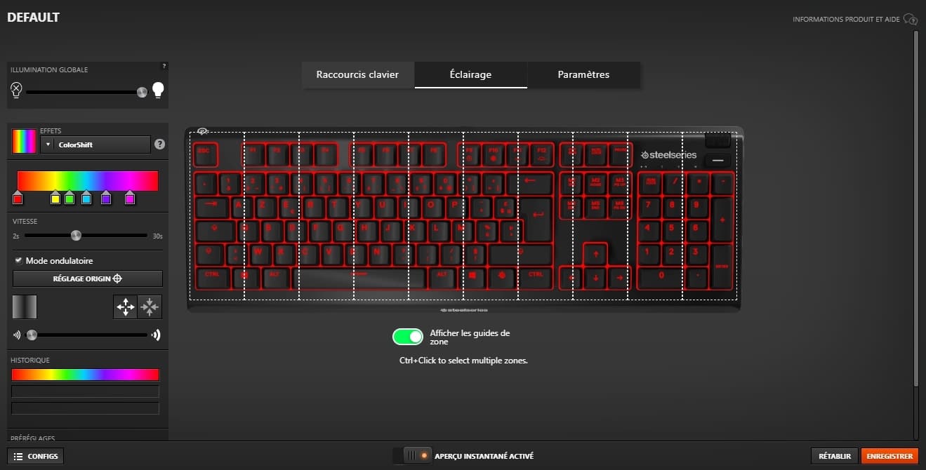 Depuis l’onglet d’éclairage, vous pouvez personnaliser l’éclairage de votre clavier. Vous découvrez alors les fameuses dix zones RVB ! J’ai trouvé cet éclairage particulièrement élégant, il offre de bonnes possibilités et un visuel qui change. Vous pouvez bien entendu opter pour une luminosité fixe, c’est à votre préférence. Le seul reproche que j’ai pu trouver concerne le fait que j’apprécie les claviers où la luminosité est un peu plus vive, mais ce n’est en rien dérangeant… Au contraire, certains apprécieront ce point de nuit, quand d’autres produits pourraient agresser les yeux !