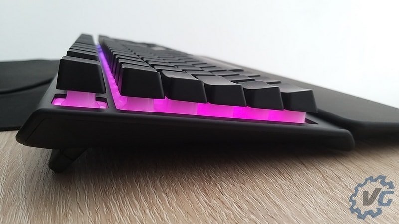 Doté de trois petits patins sous le clavier, on peut supposer que ce dernier supporte sans mal les sessions de jeux les plus animées, mais je n’ai pas réellement plus le mettre à rudes épreuves. Pour autant, aucun souci n’a été à déplorer de ce côté, alors aucune inquiétude ! De plus, vous pouvez régler la hauteur de votre clavier (sur un seul angle néanmoins), afin d’être d’autant plus à l’aise.