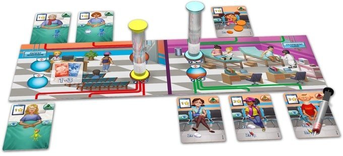 Pour soigner des patients… il faut des patients. Dans la zone d’admission, une infirmière permet de piocher et révéler trois cartes Patients, réguliers ou hospitalisés. Seul un médecin peut ensuite décider d’hospitaliser un patient en prenant sa carte et en la mettant dans l’un des six lits des pavillons, où il restera jusqu’à sa guérison. Un médecin ou une infirmière peut traiter un patient dans la clinique ambulatoire en posant sur sa carte les éléments requis, une petite intraveineuse, quelques médicaments… Pour l’intraveineuse, on met dans une seringue les jetons de la couleur requise (sang, médicament jaune, médicament vert).