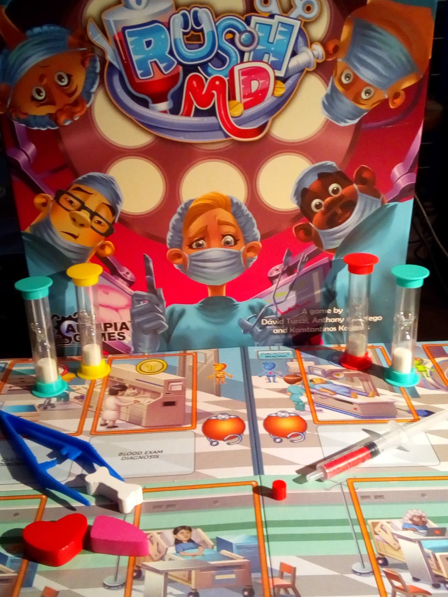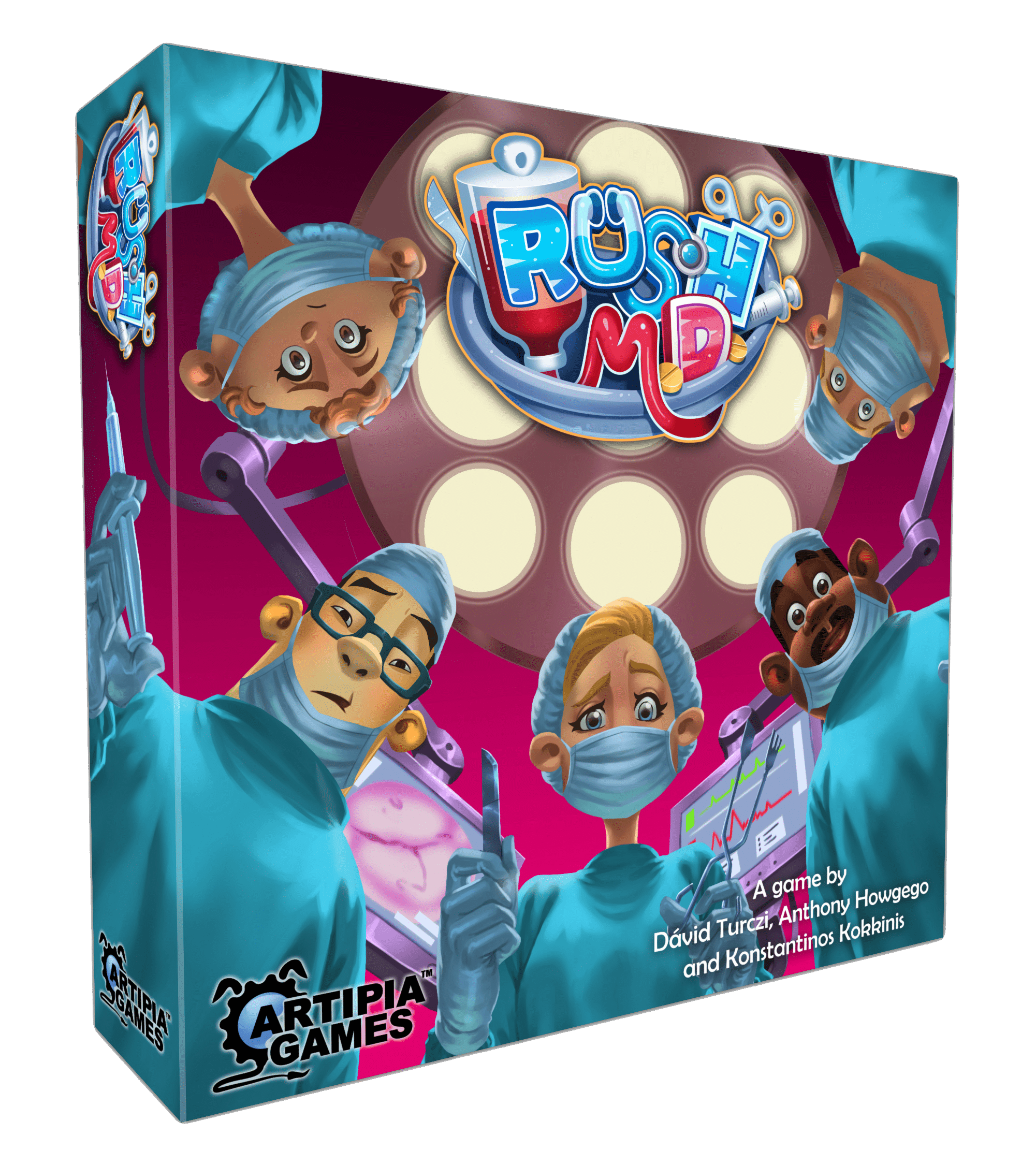 On a beaucoup parlé de jeux de société simultanés récemment, tant coopératifs que compétitifs, avec la présentation de Magic Maze on Mars, Space Bowl, WormLord, House Flippers… Tous ces jeux étaient dus au même éditeur, Sit Down!, ce qui aurait pu laisser croire à son monopole dans ce genre si Artipia (A Thief’s Fortune, 13 Fantômes, La Quête du Bonheur) ne s’était pas fait remarquer de façon si notable en 2017 avec le Kitchen Rush du mythique David Turczi (Anachrony, Cerebria, Perseverance), d’ailleurs remis à l’honneur récemment avec la localisation de son extension Piece of Cake par Geek Attitude Games (Not Alone, Sherlock Q-System, Dicium, Bruxelles 1897, Taverna). Or je parlais dans mes comptes-rendus d’Essen de Rush M.D., la « suite » de Kitchen Rush nous plaçant cette fois dans un hôpital, et dont GAG vient d’annoncer la traduction prochaine sous le titre Clinic Rush (effectivement plus parlant pour les francophones).