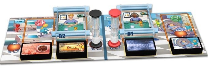 Les jetons Cultures sont posés face cachée à côté de la zone de cultures, le tuile IRM à côté de la zone d’IRM, et la tuile Examen sanguin près de la zone d’examen sanguin, en plaçant dans ses 7 trous des petits jetons blancs et rouges dans un ordre défini par les règles.