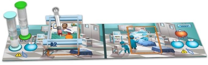 Enfin, dans les salles d’opération, on peut donner des organes au patient avec un sablier Médecin et des médicaments ou du sang en intraveineuse avec un sablier Infirmière… mais on ne peut rien manipuler qu’avec des pinces, à l’exception des seringues, que l’on peut tenir avec une main pendant qu’avec l’autre on tente d’attraper les jetons Sang pour les y insérer !